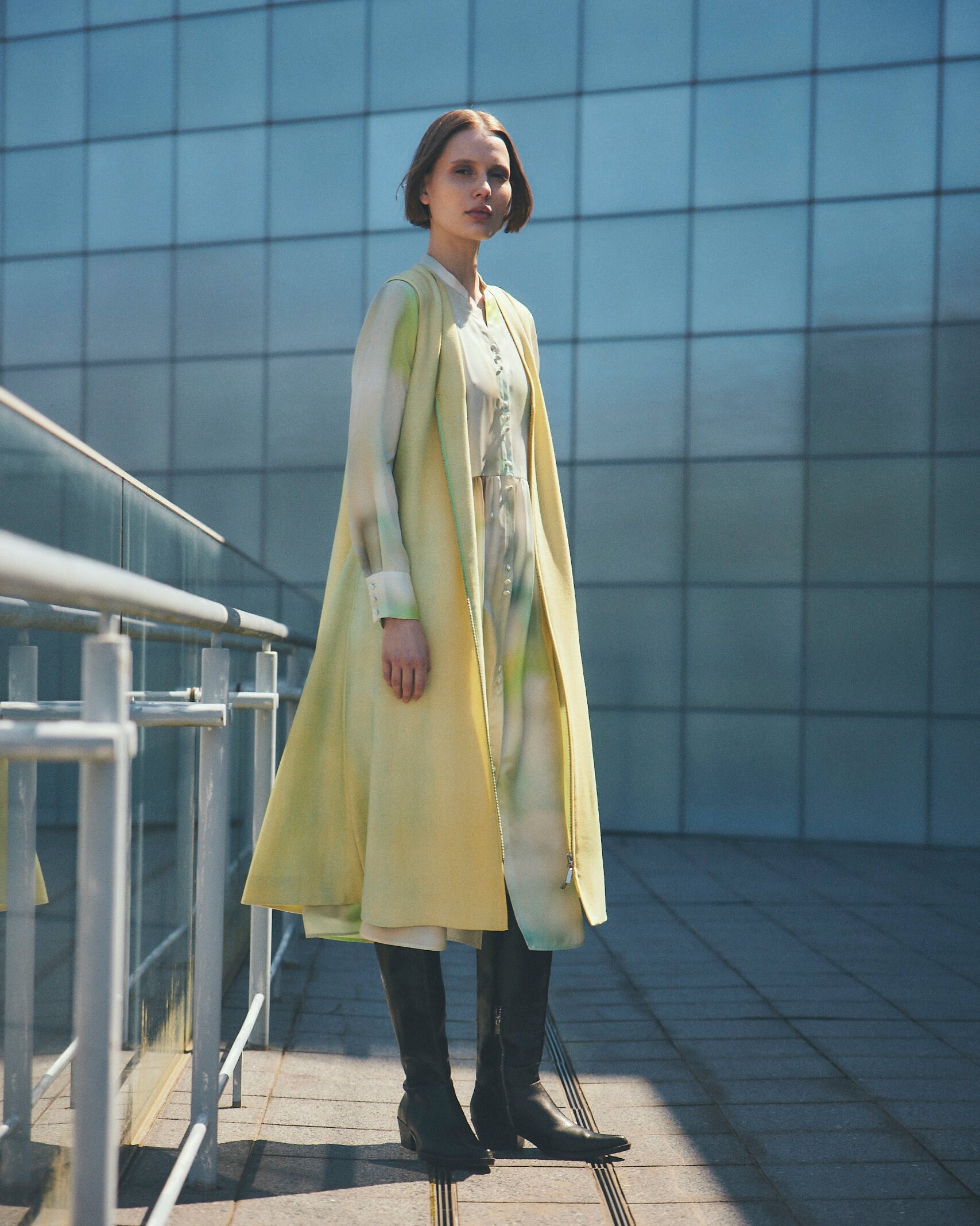光の帯をイメージした切り替えから流れるギャザーがシルメットにメリハリをつけ、春先には羽織としてもオススメな一枚です。
