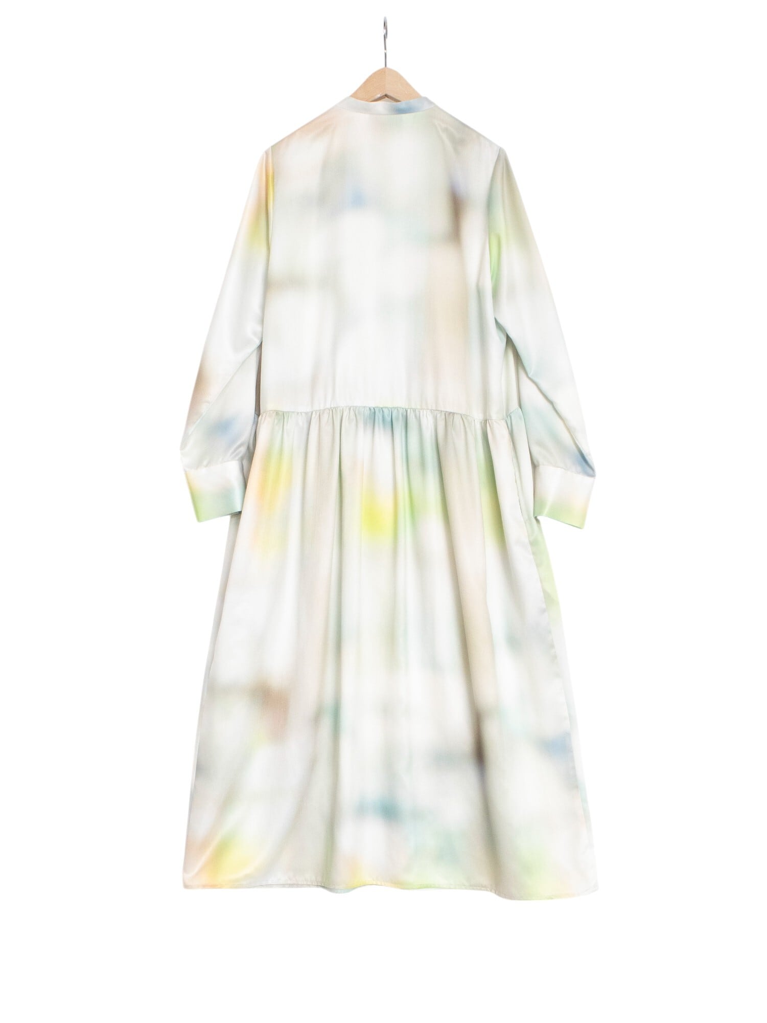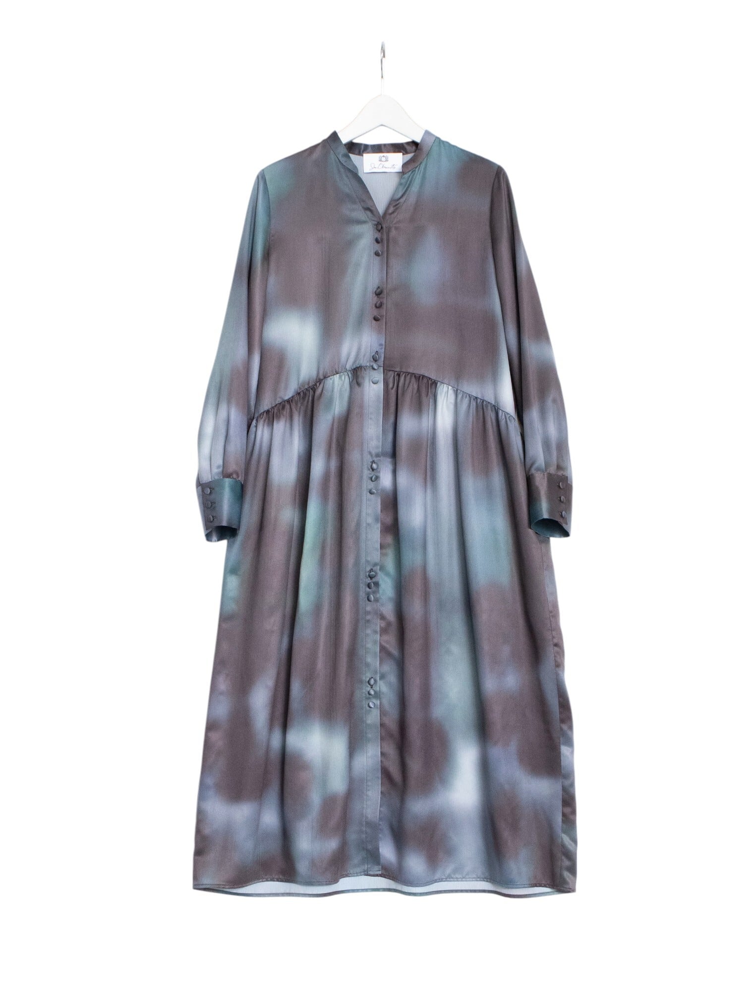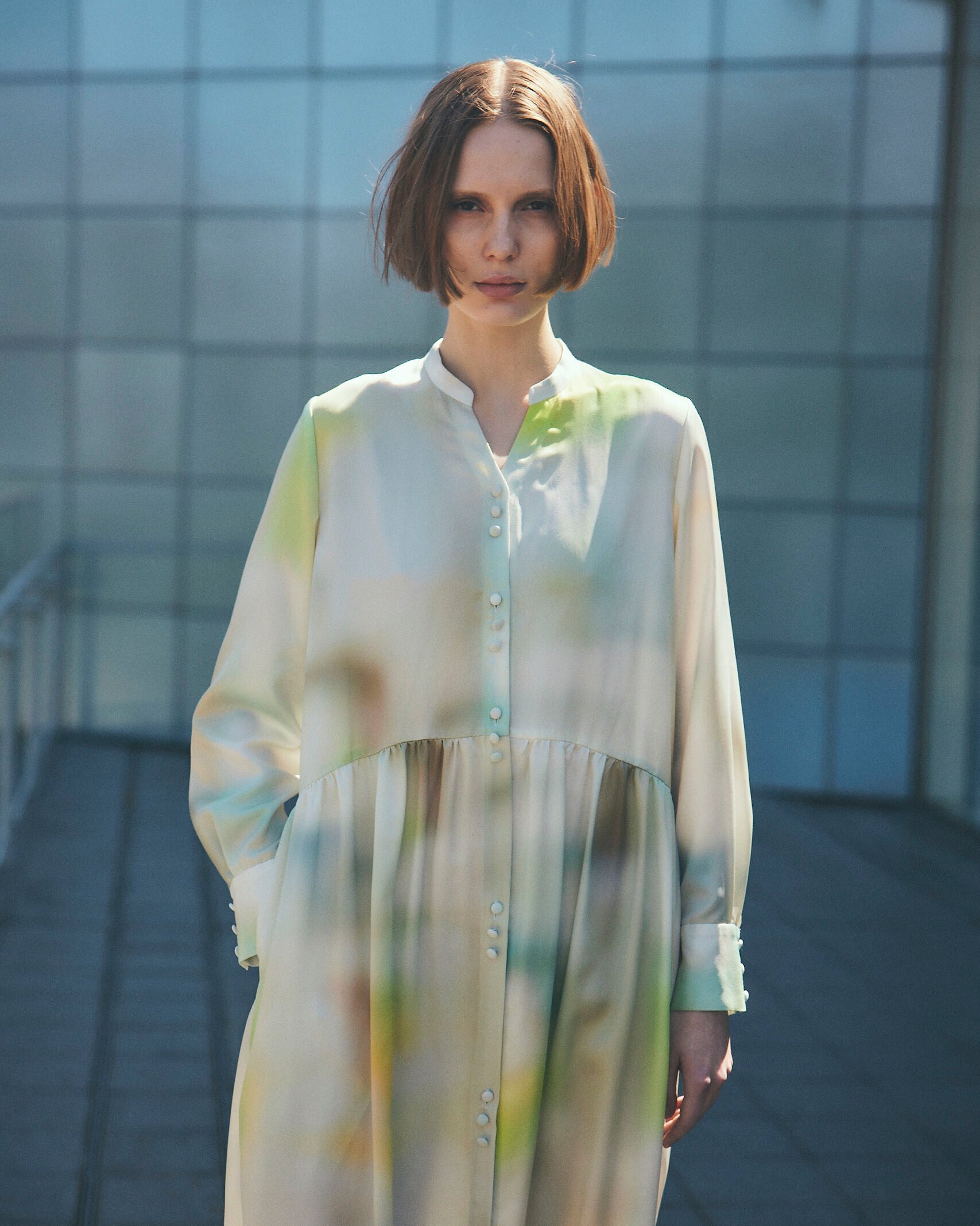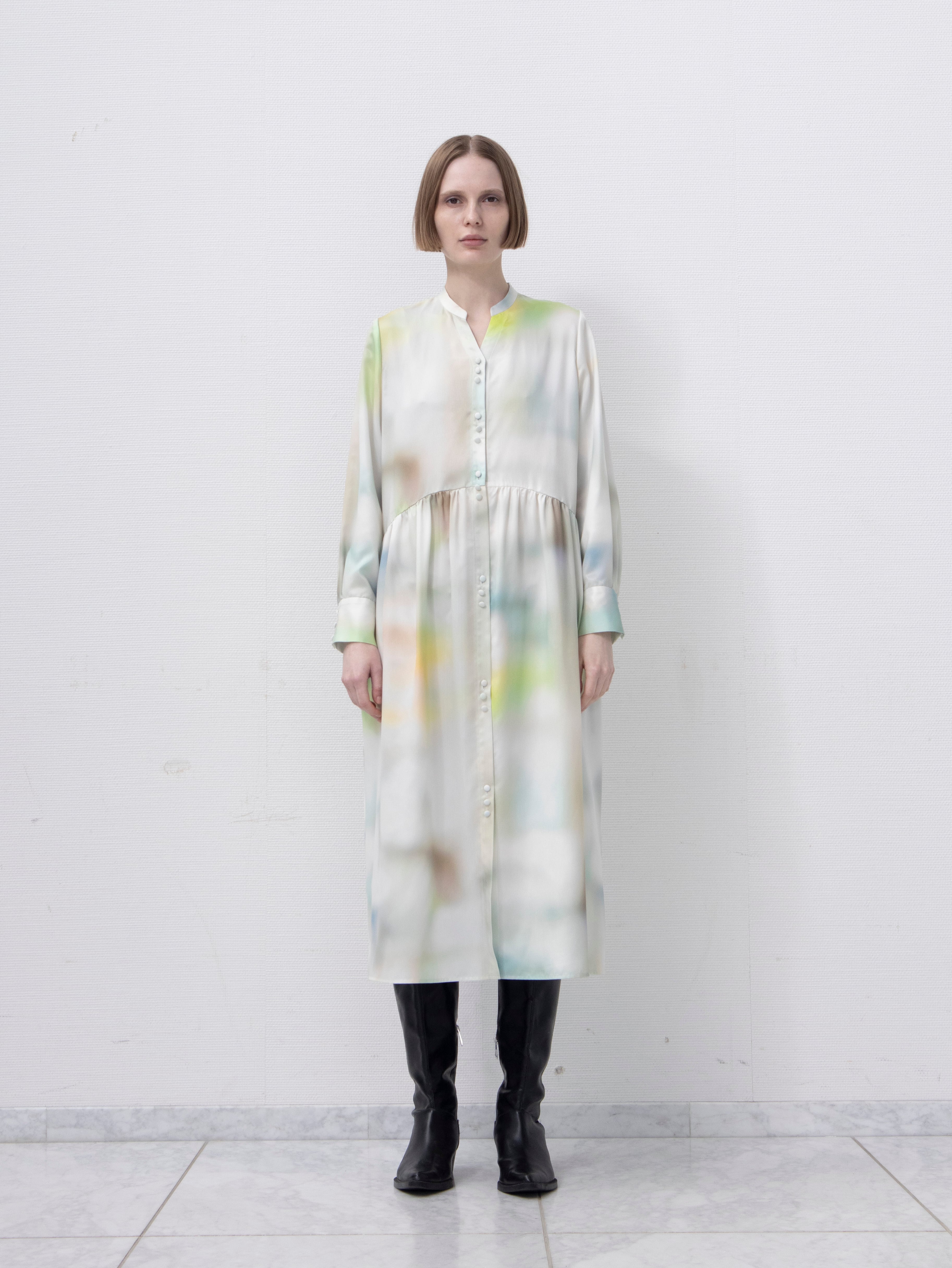 25AWのテーマであるオーロラをイメージしたオリジナルプリントが幻想的なウエストギャザーシャツワンピース。