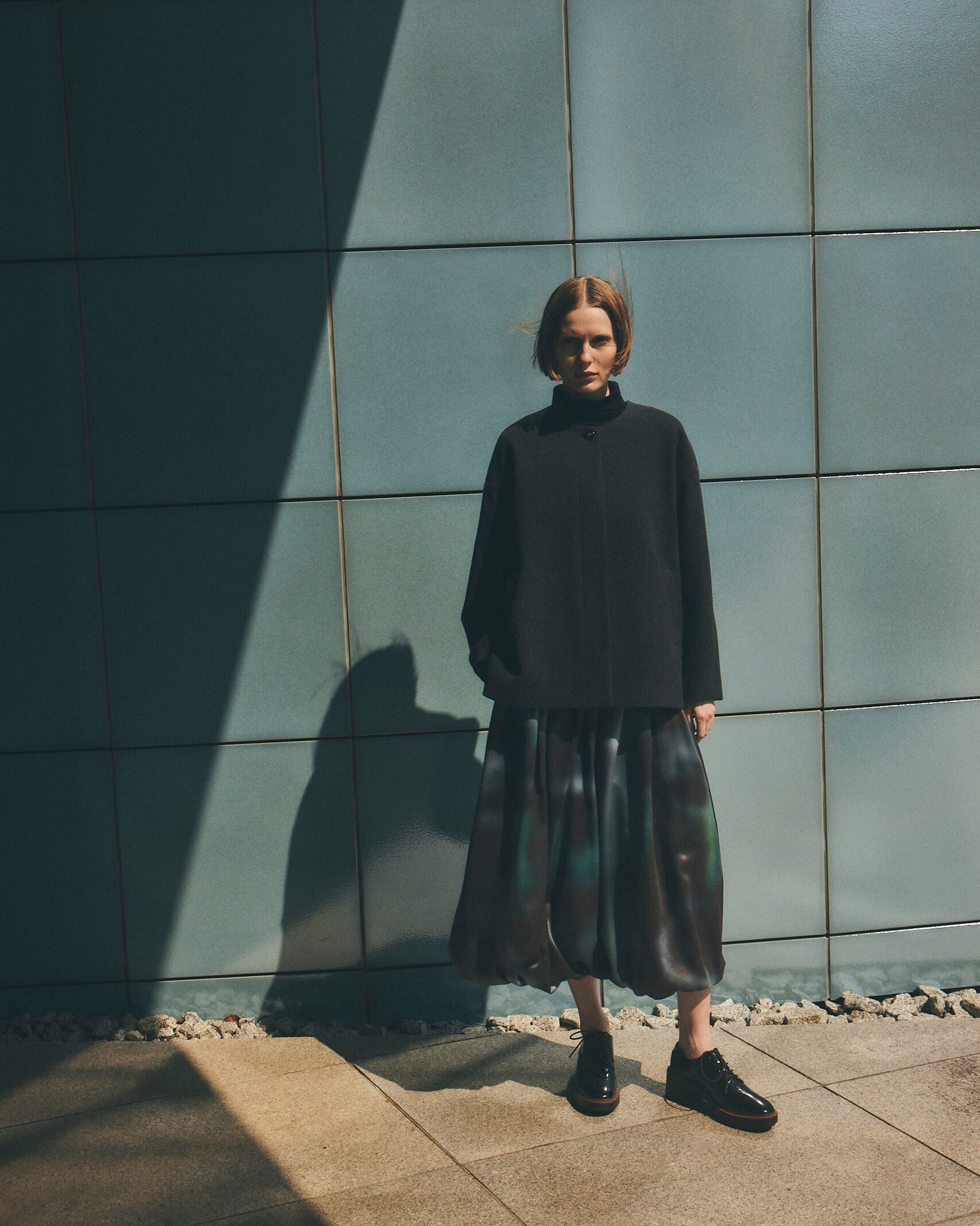 25AWのテーマであるオーロラをイメージしたオリジナルプリントが幻想的なバルーンスカート。