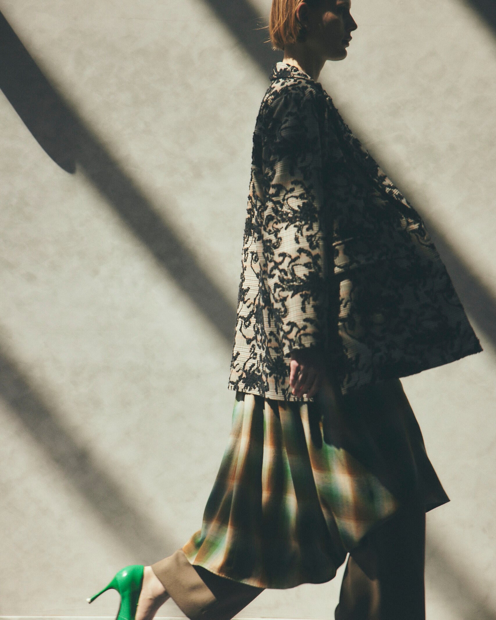 JUN OKAMOTOのシグネチャーである、後ろ身頃に施された流れるようなドレープが印象的。