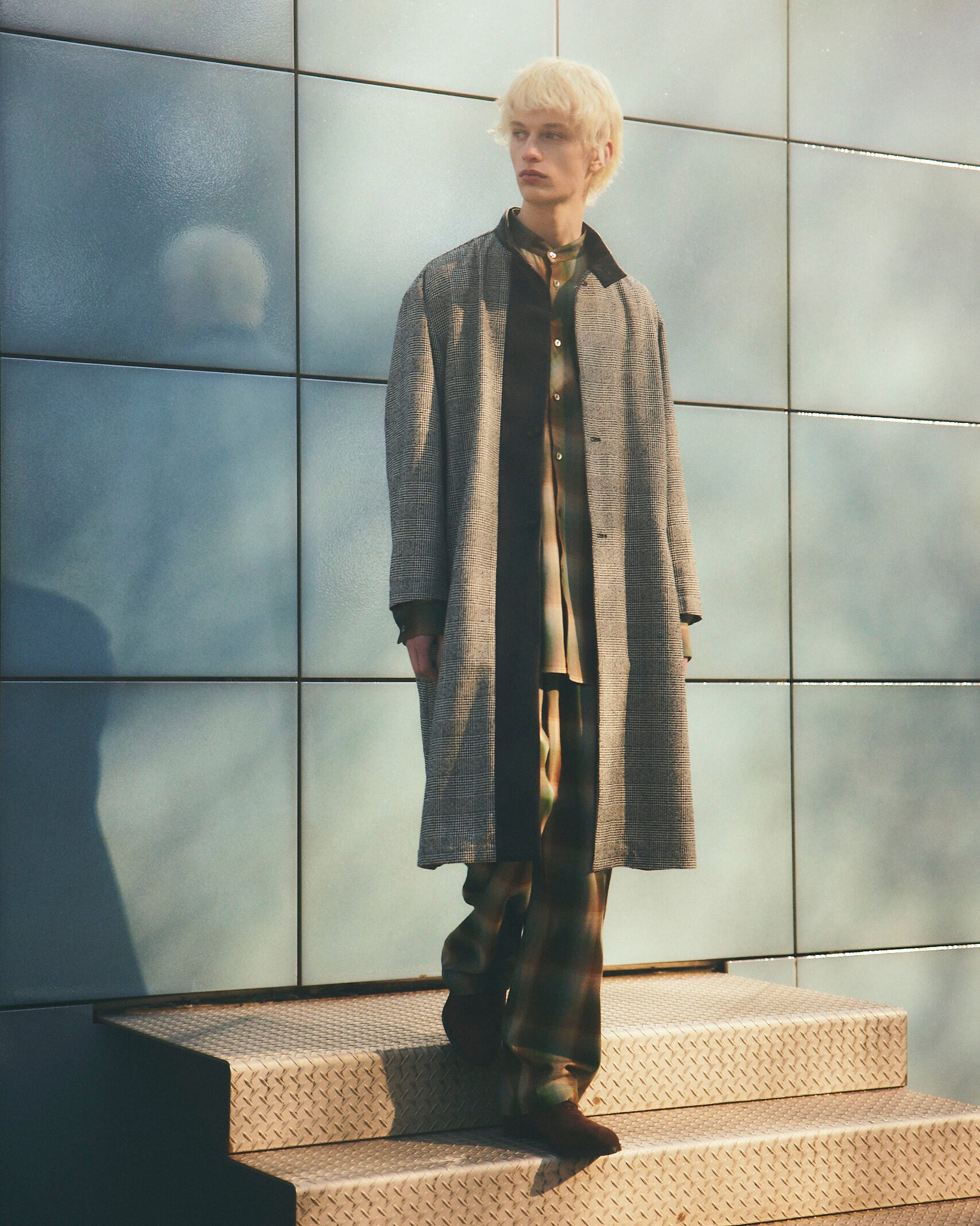 同素材のシャツと合わせた、セットアップスタイルもおすすめです。