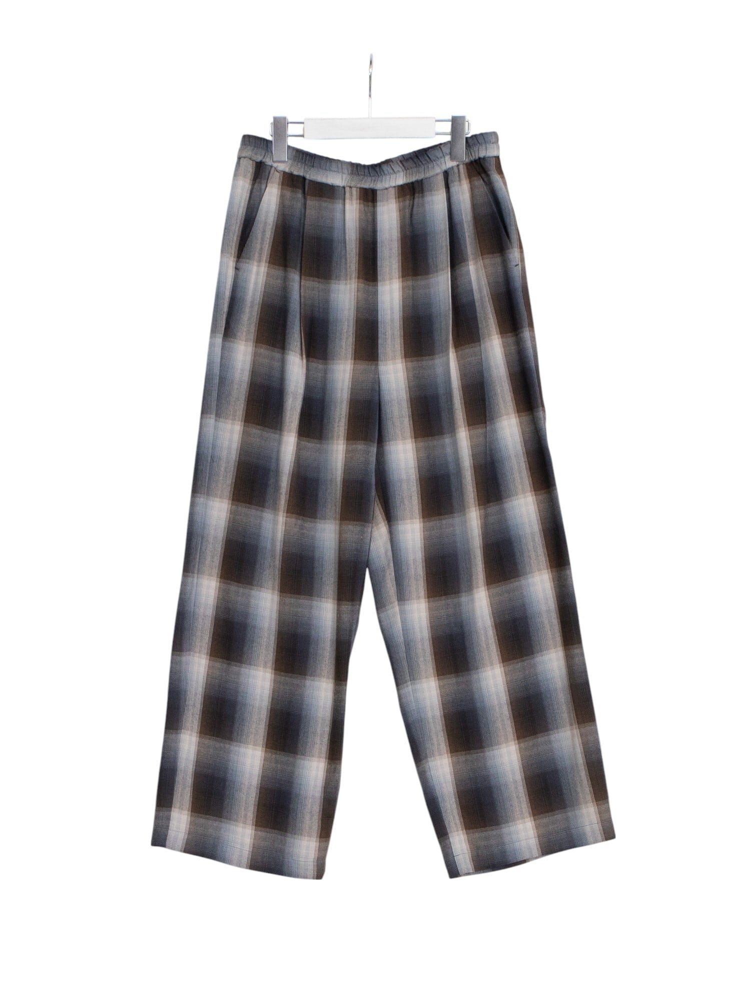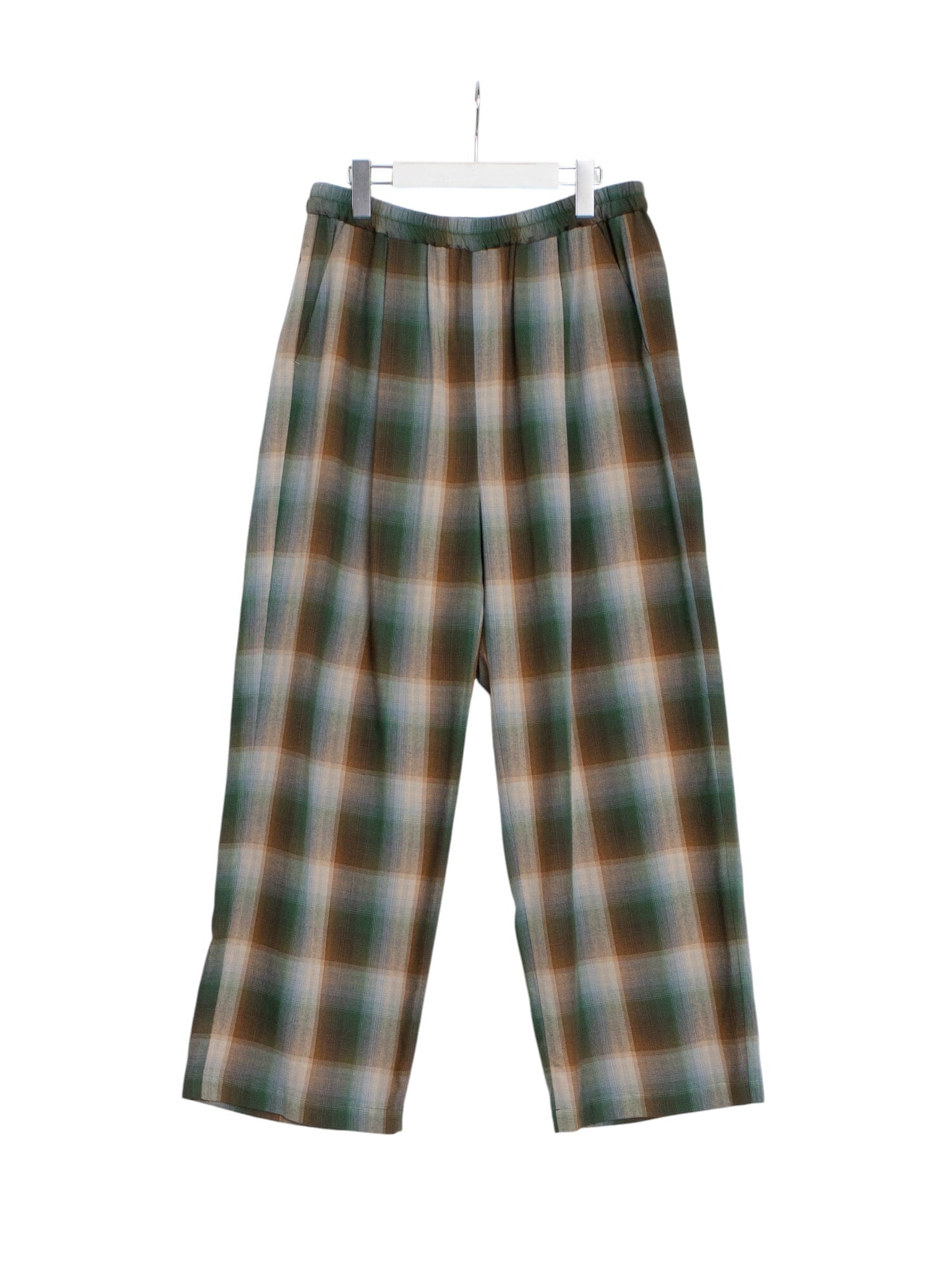 レーヨンの上品な光沢とドレープ感が美しいオンブレチェックイージーパンツ。
