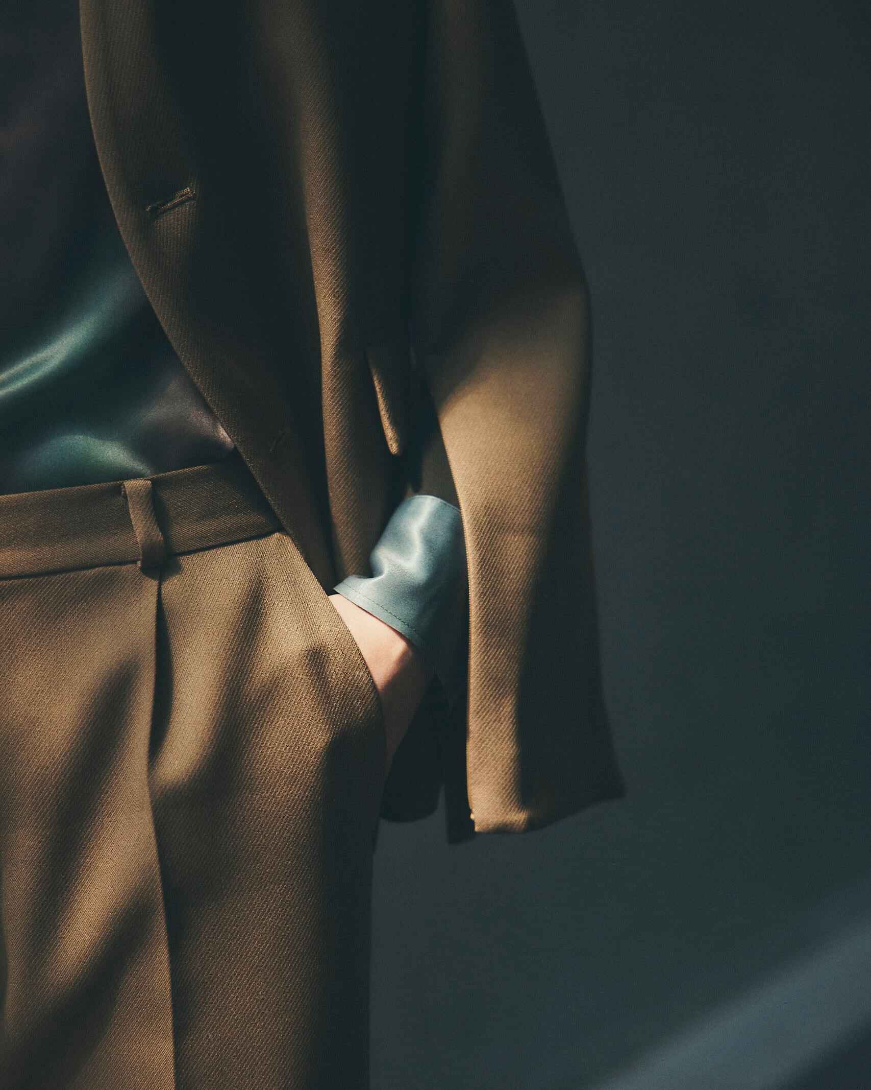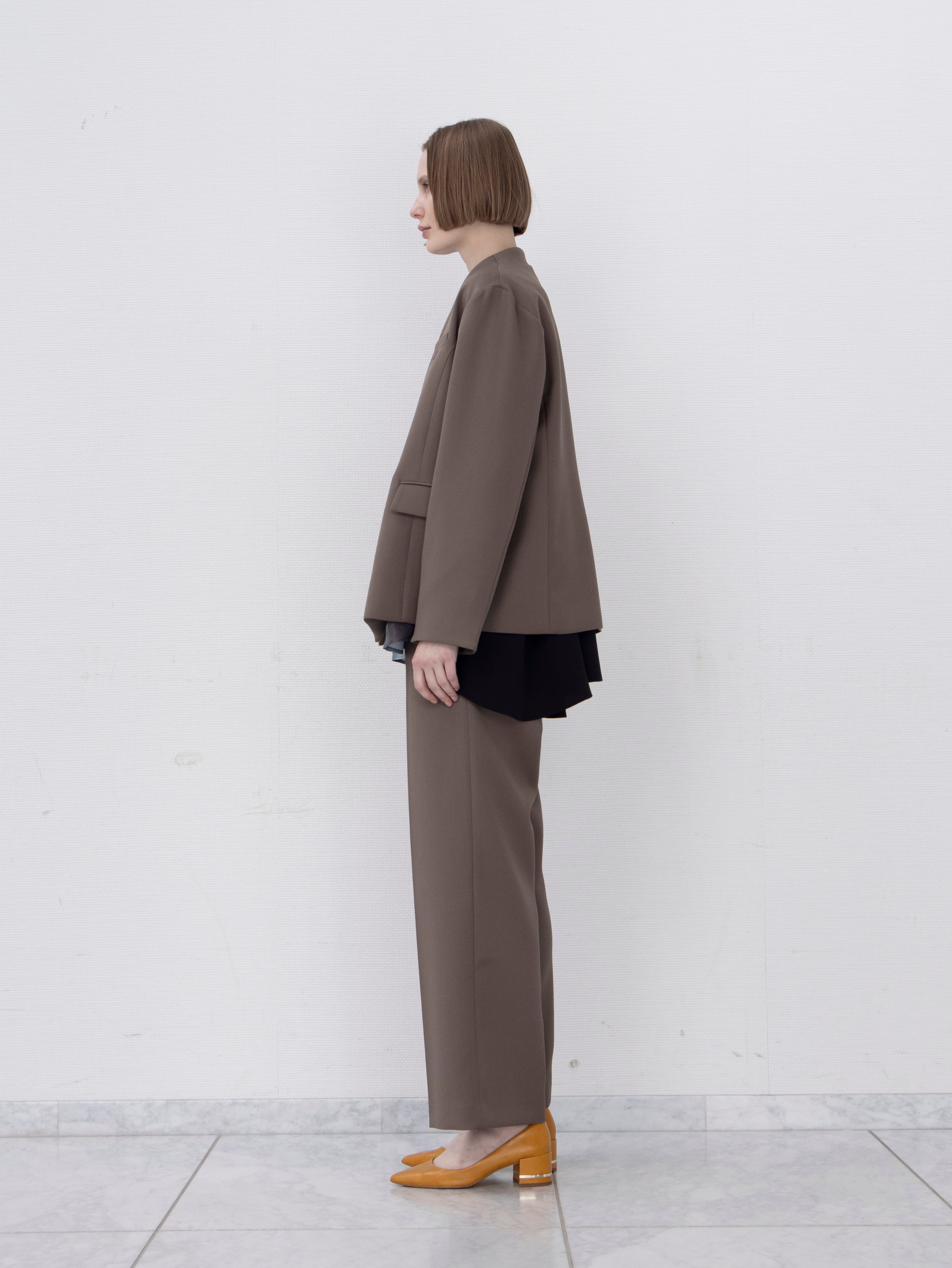 センタープレスが脚のラインを美しく見せる、上品な一着です。