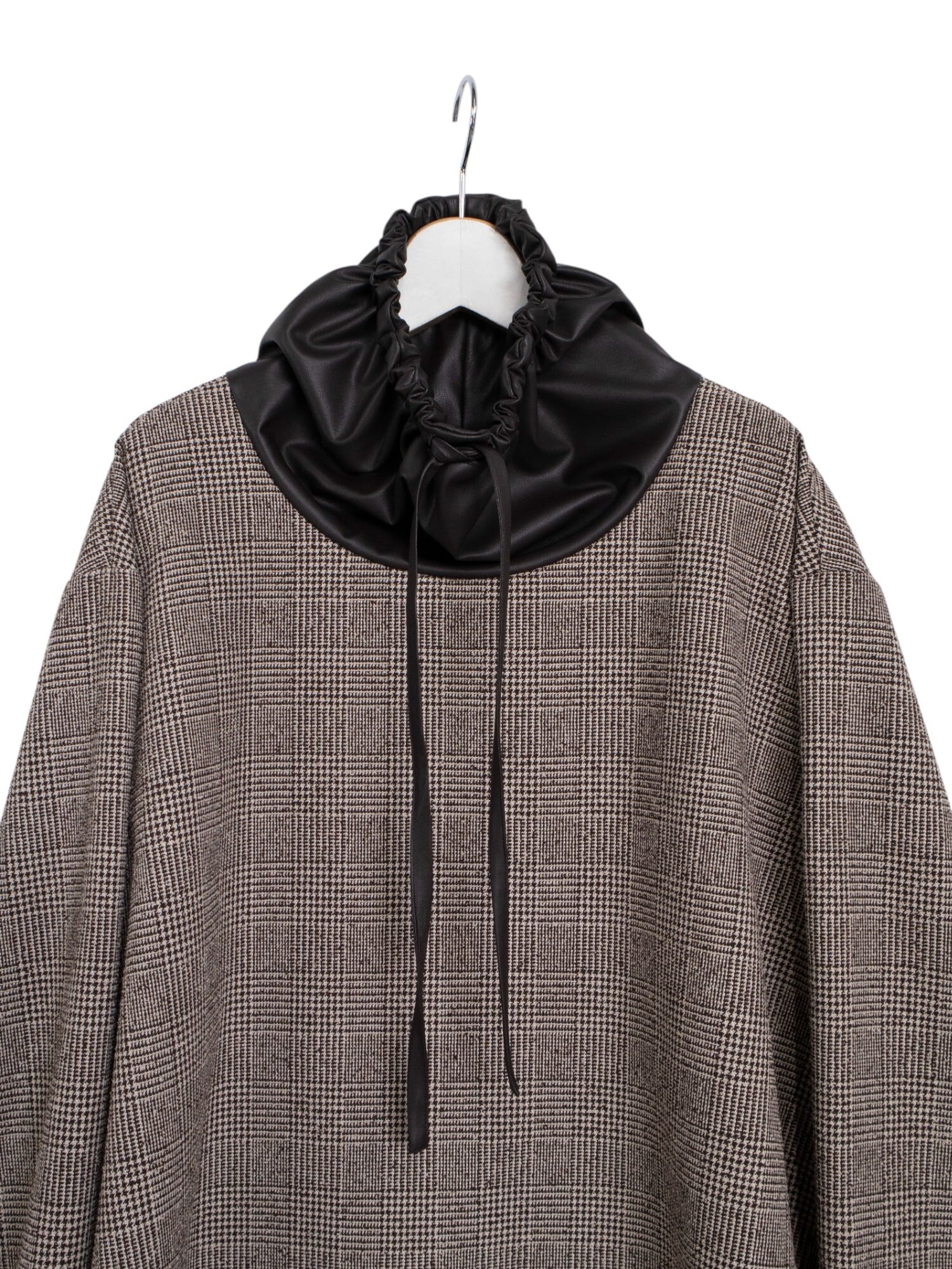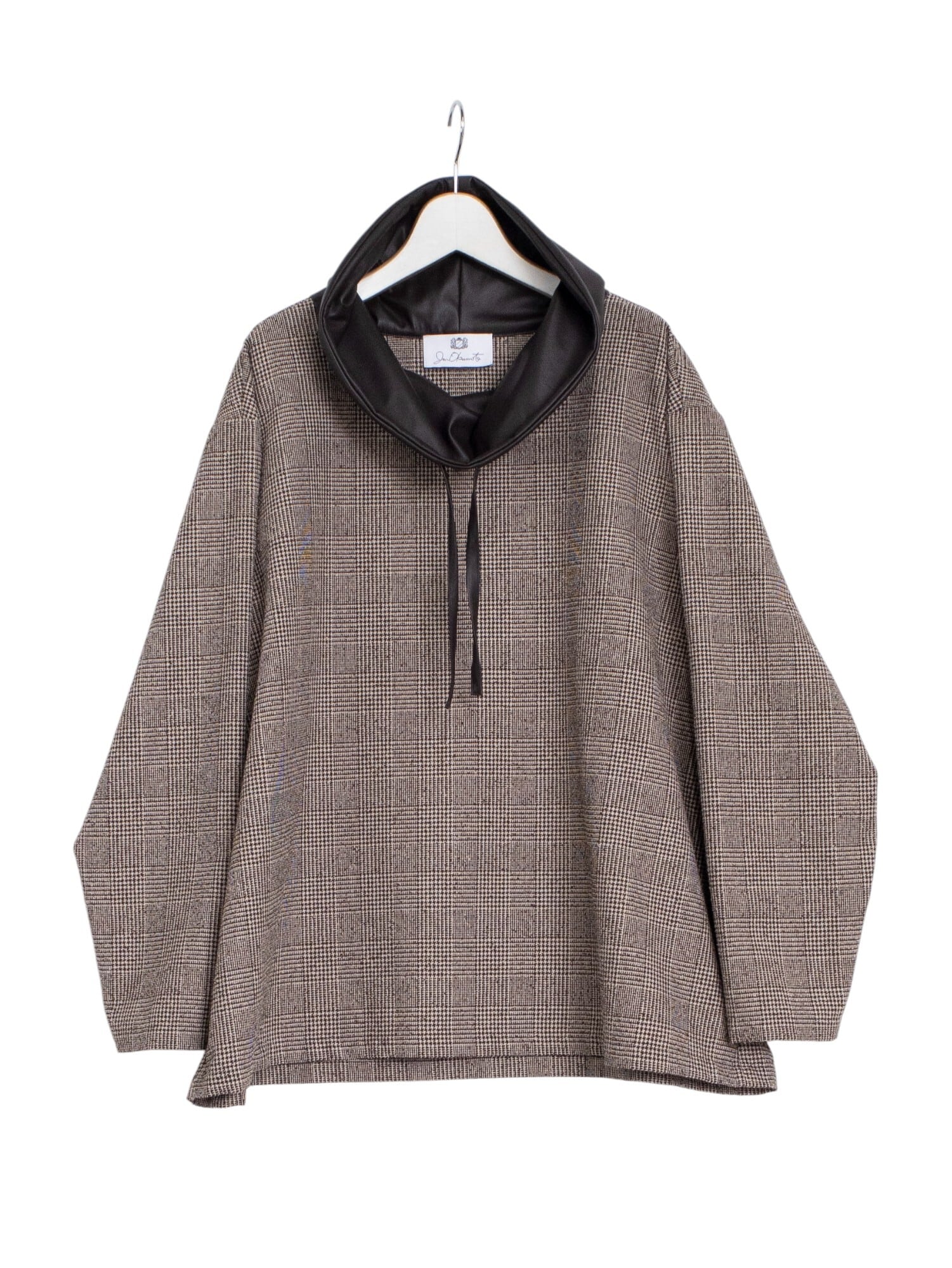 レーヨンリング糸でツィード調に仕上げたグレンチェック生地と、フェイクレザーの異素材使いが、洗練された印象を与えるトップス。