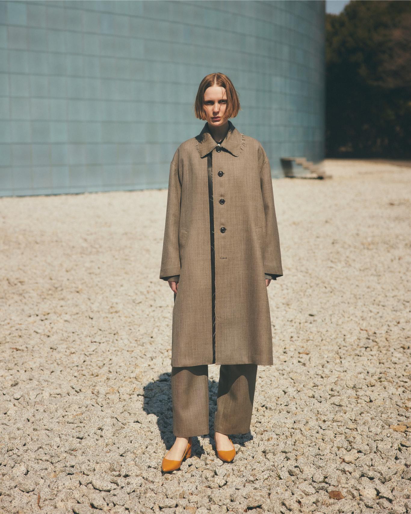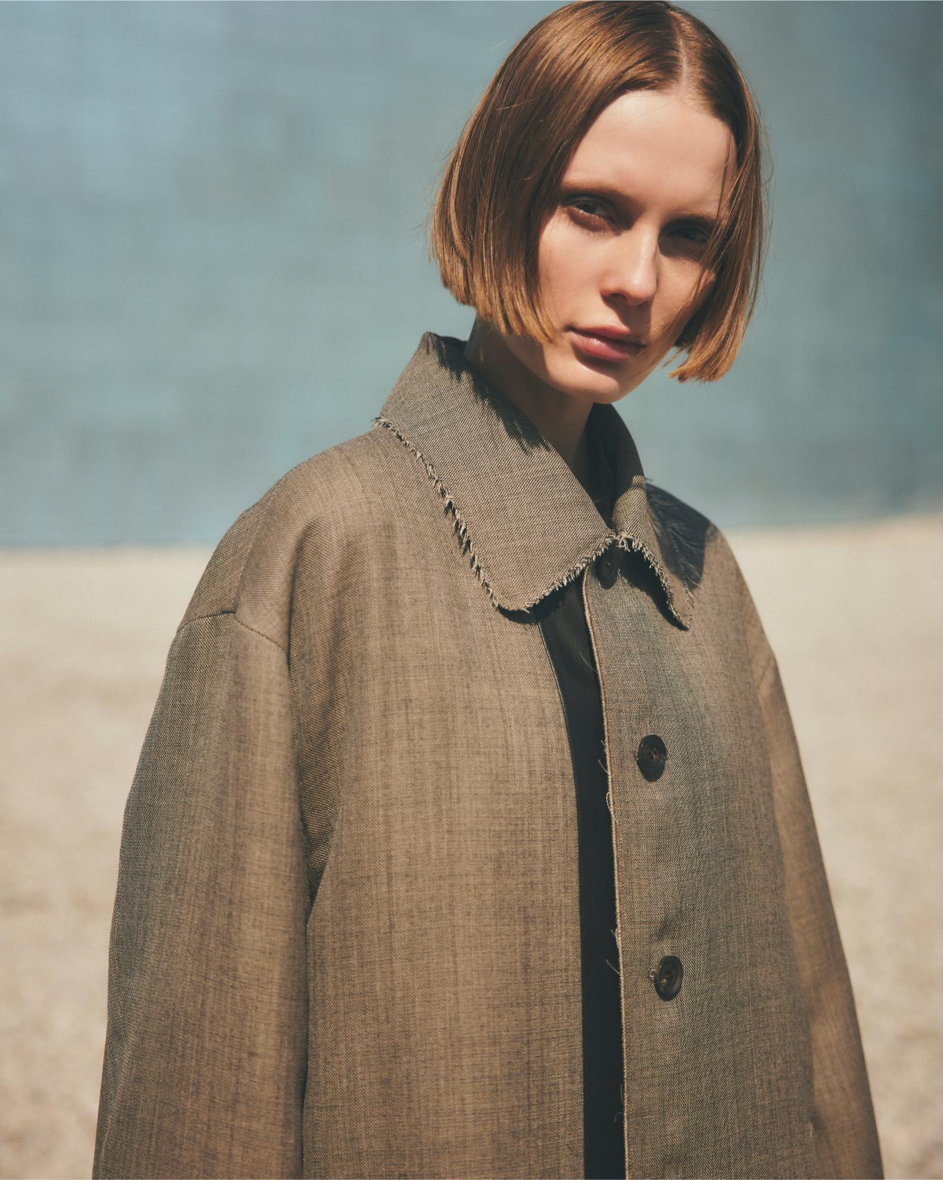 ミニマルなデザインながら、立体的なパターンと、襟元と前端の切りっぱなしディテールが、モードな雰囲気を演出します。