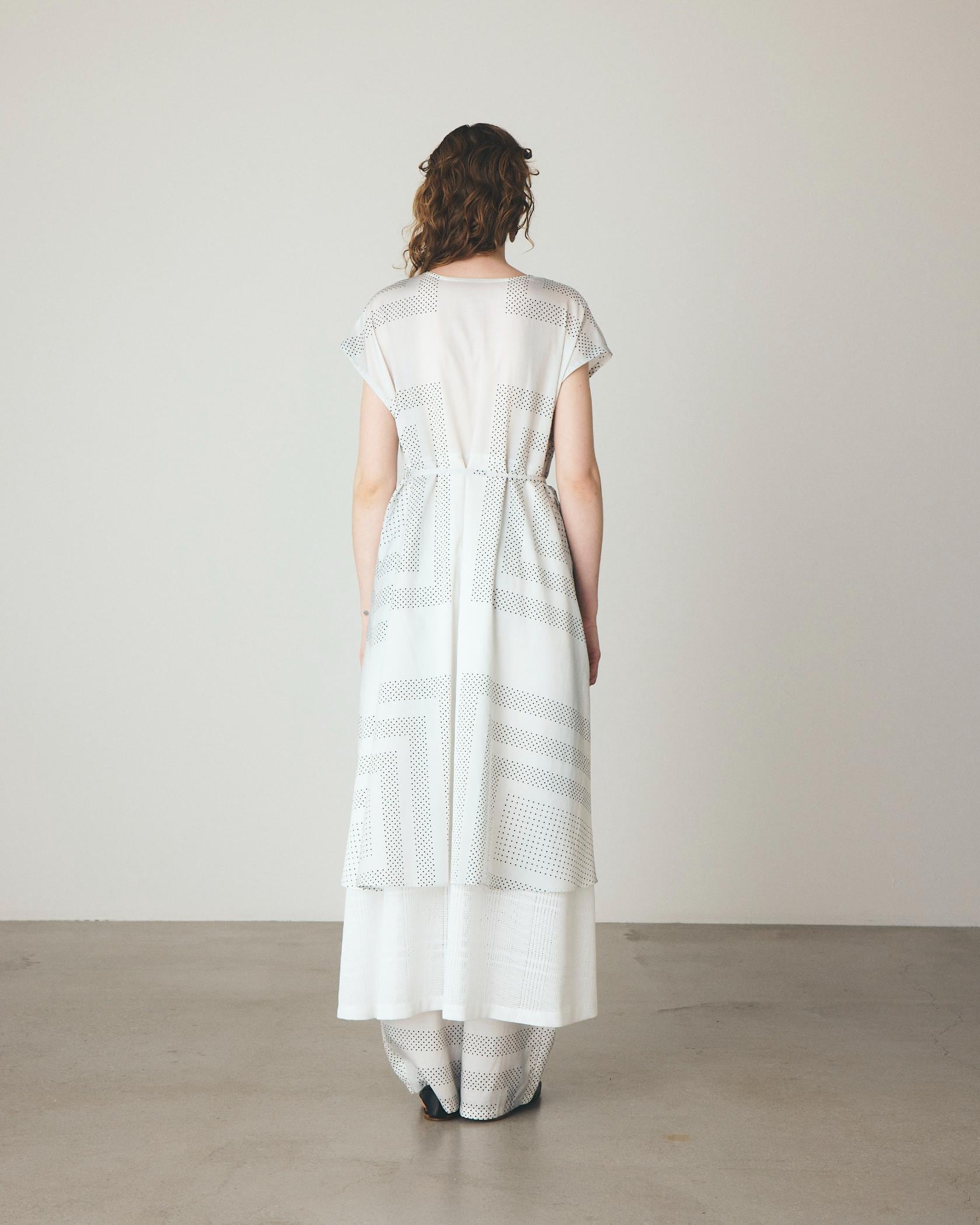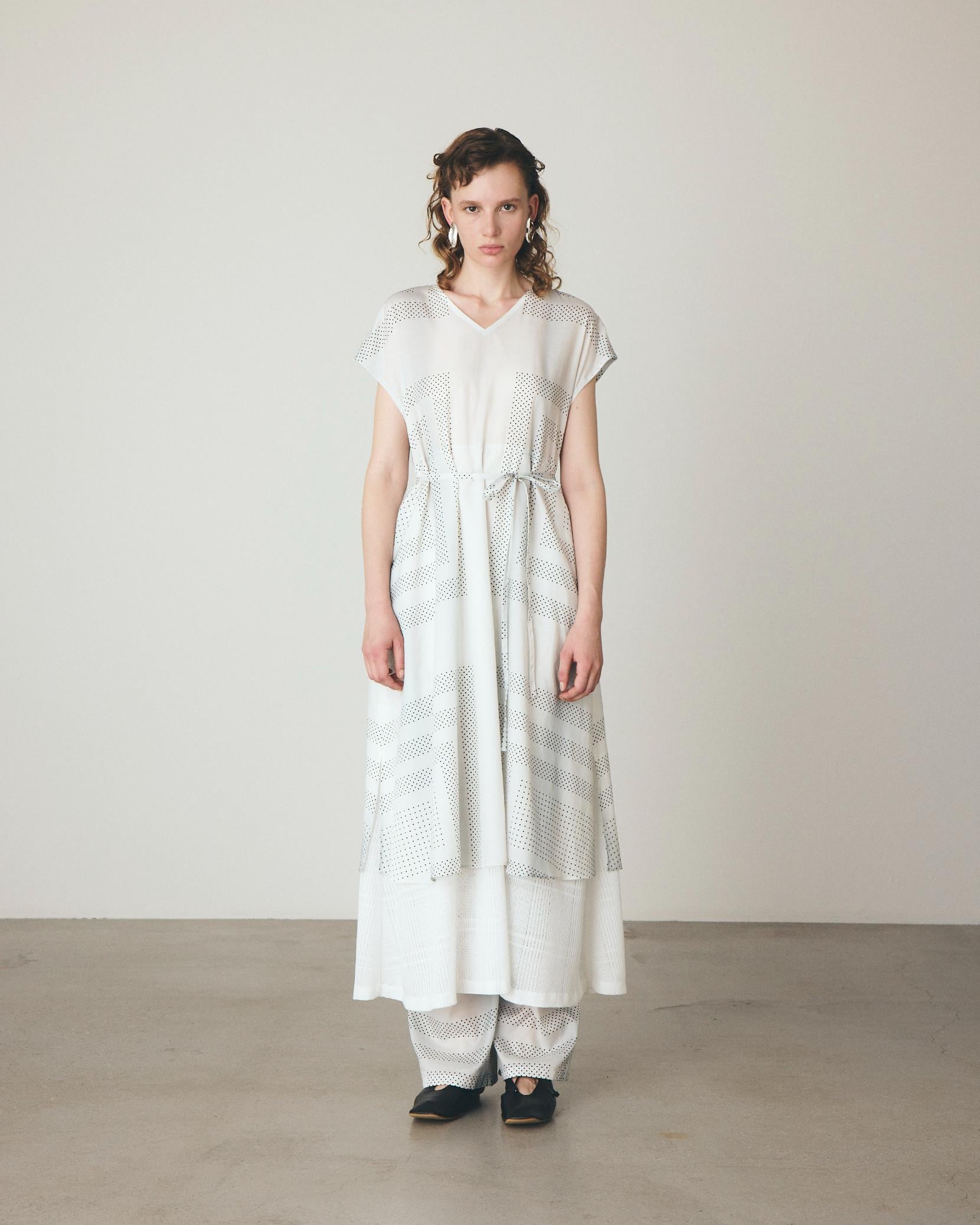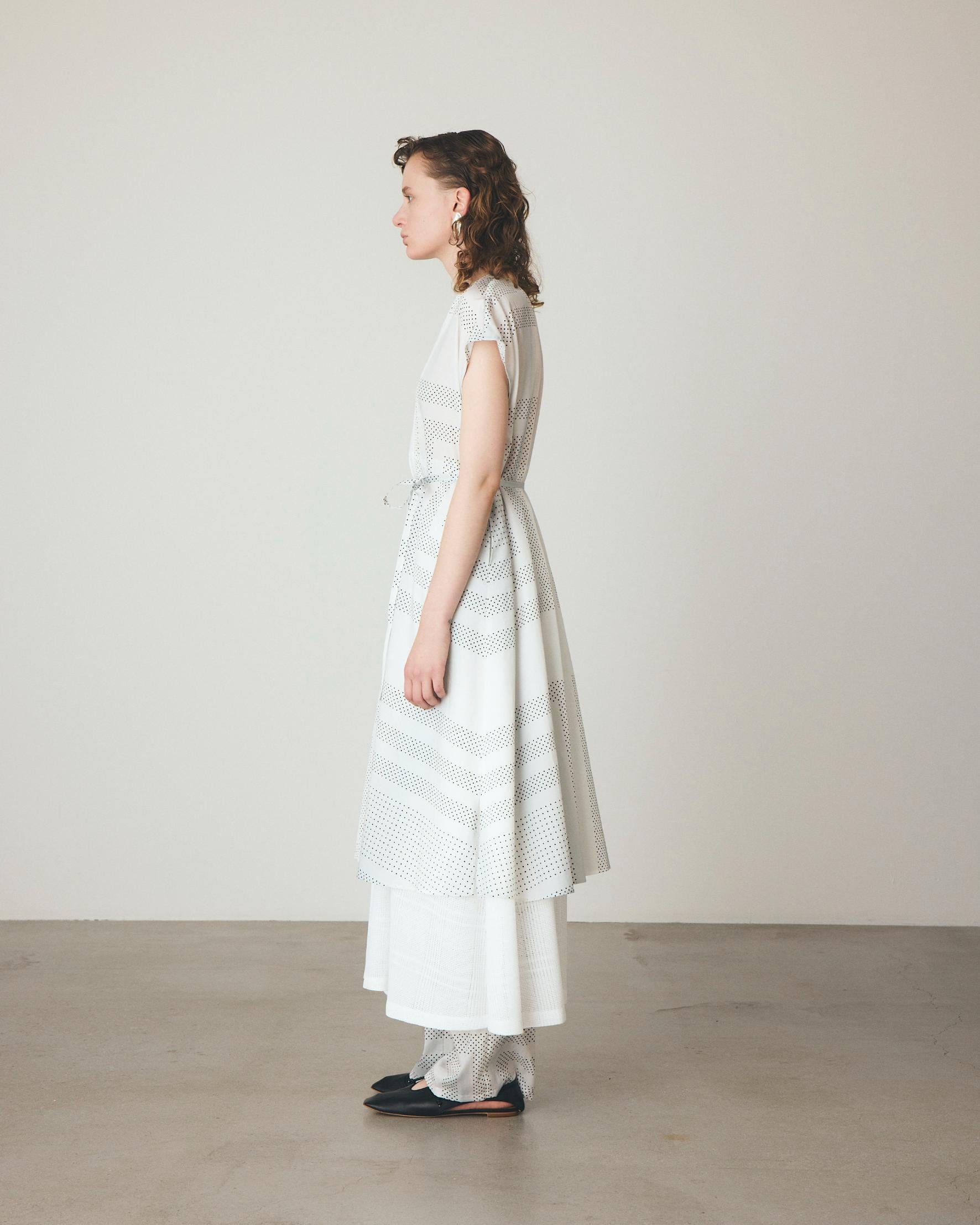 オリジナルで描き起こしたプリントは、細かなドットをスカーフのカレ風にアレンジし、縞のように淡く流れるグラデーションで情緒的な雰囲気を表現。