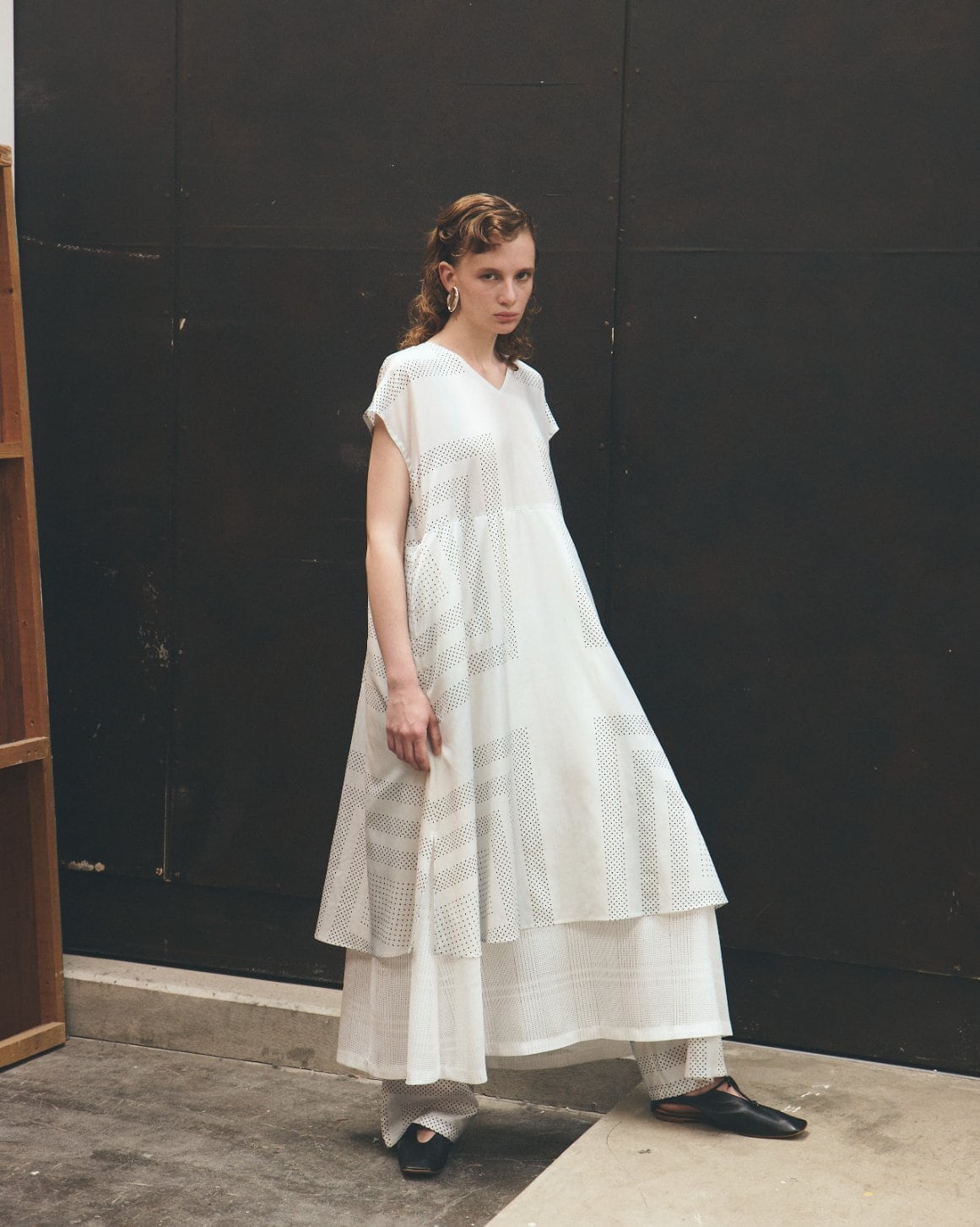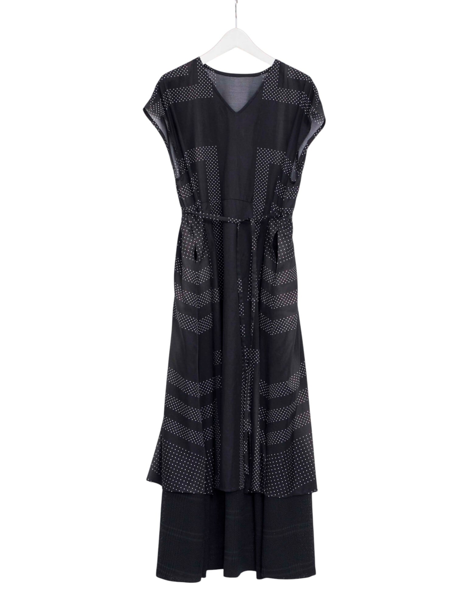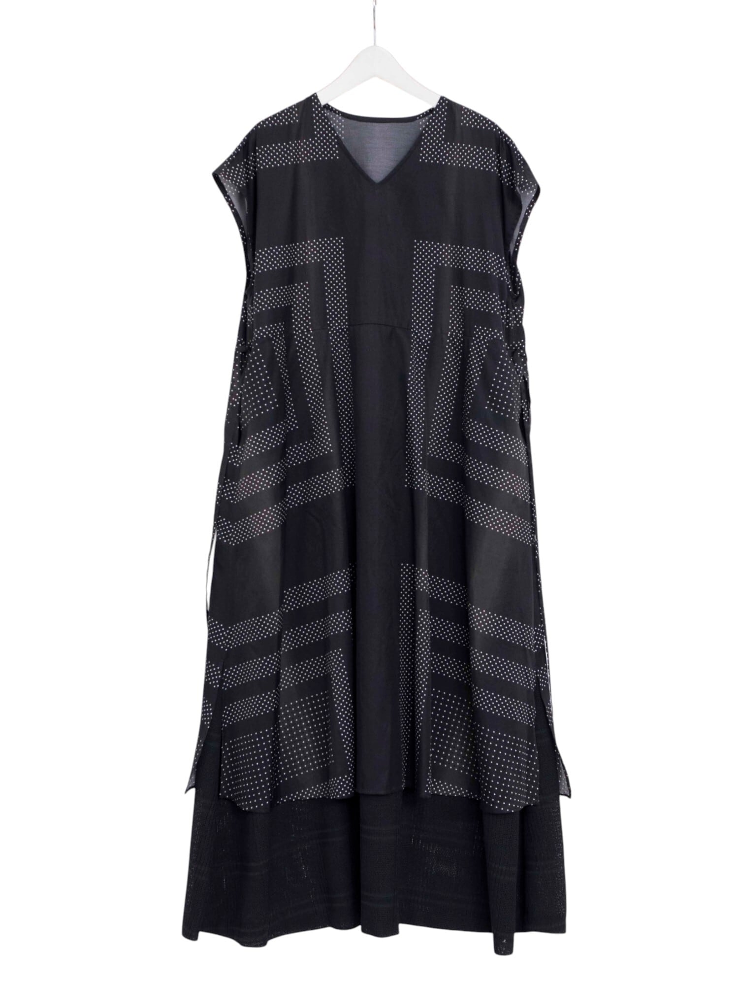 オリジナルで描き起こしたプリントは、細かなドットをスカーフのカレ風にアレンジし、縞のように淡く流れるグラデーションで情緒的な雰囲気を表現。