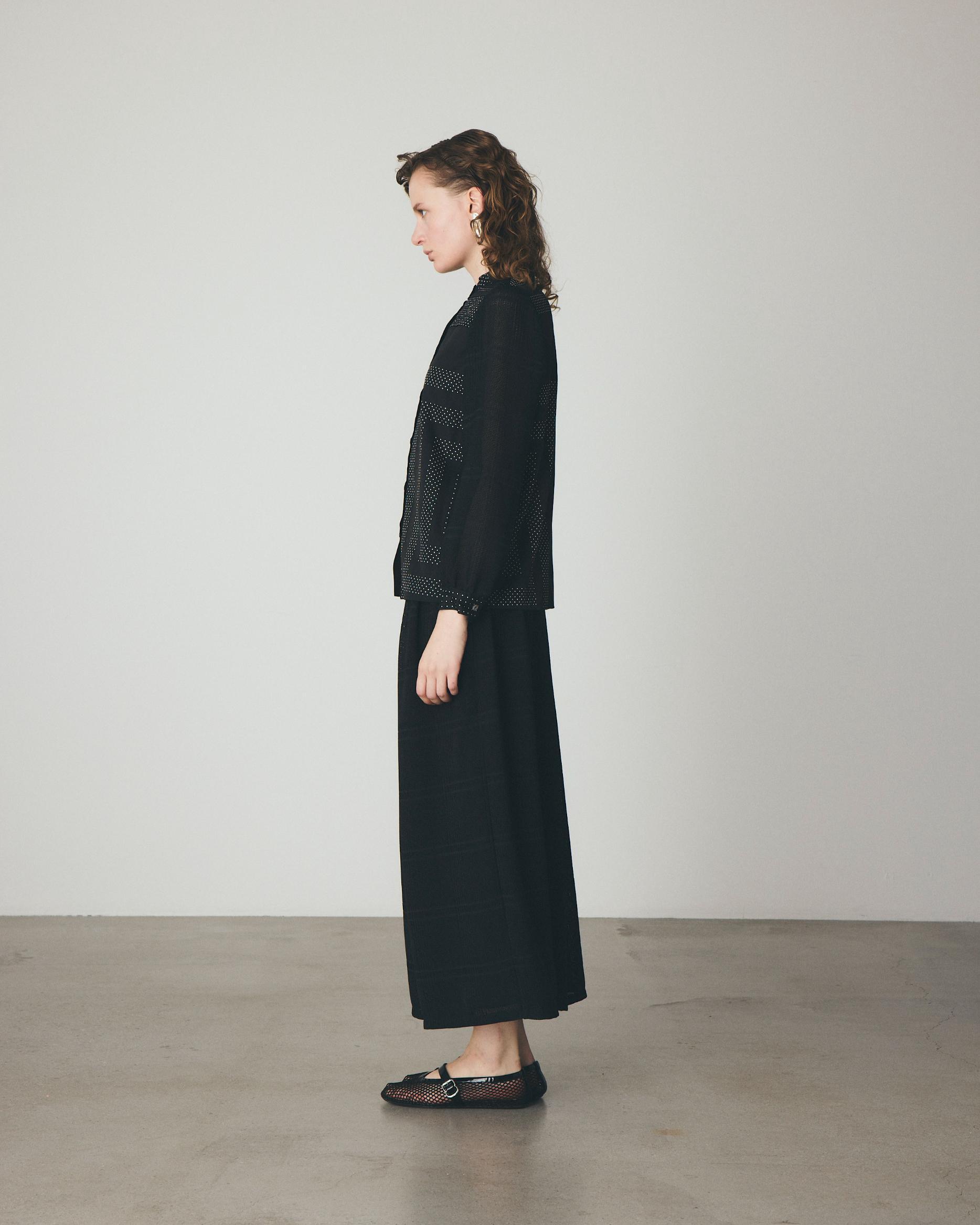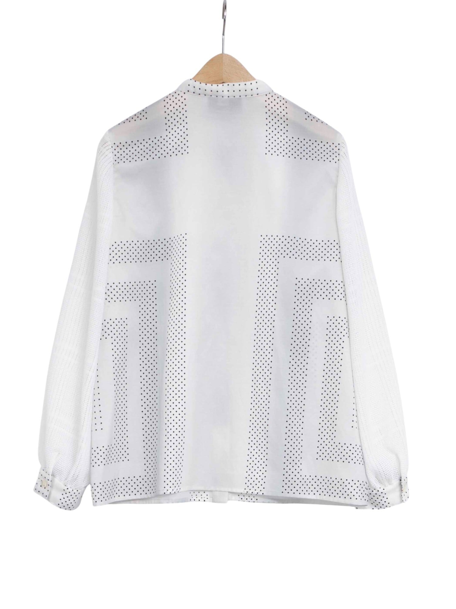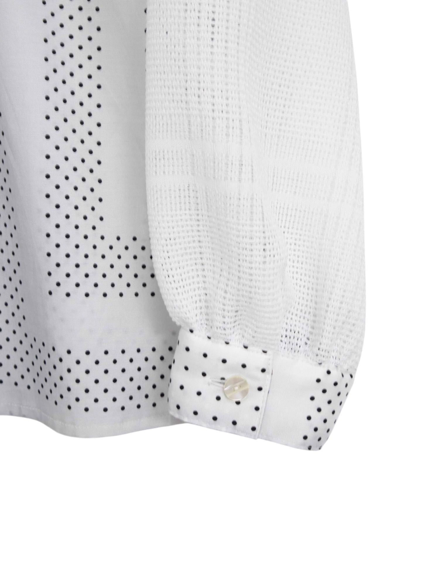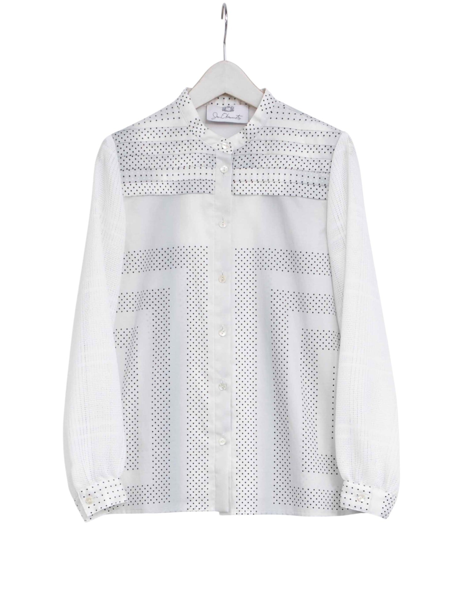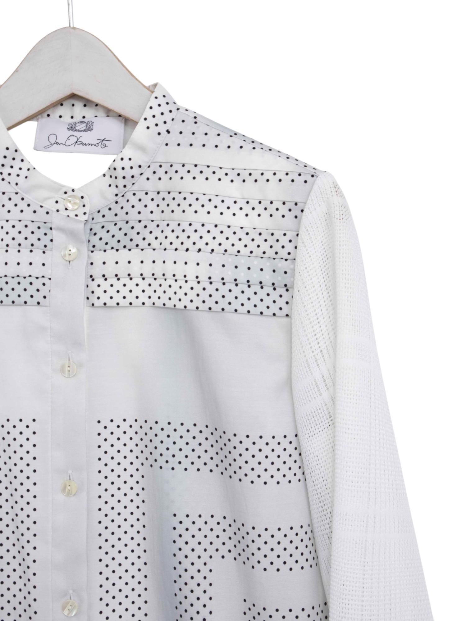 オリジナルで描いたドット柄をカレ風に構成し、ほんのりストライプ状のグラデーションで奥行きを表現したプリントブラウス。