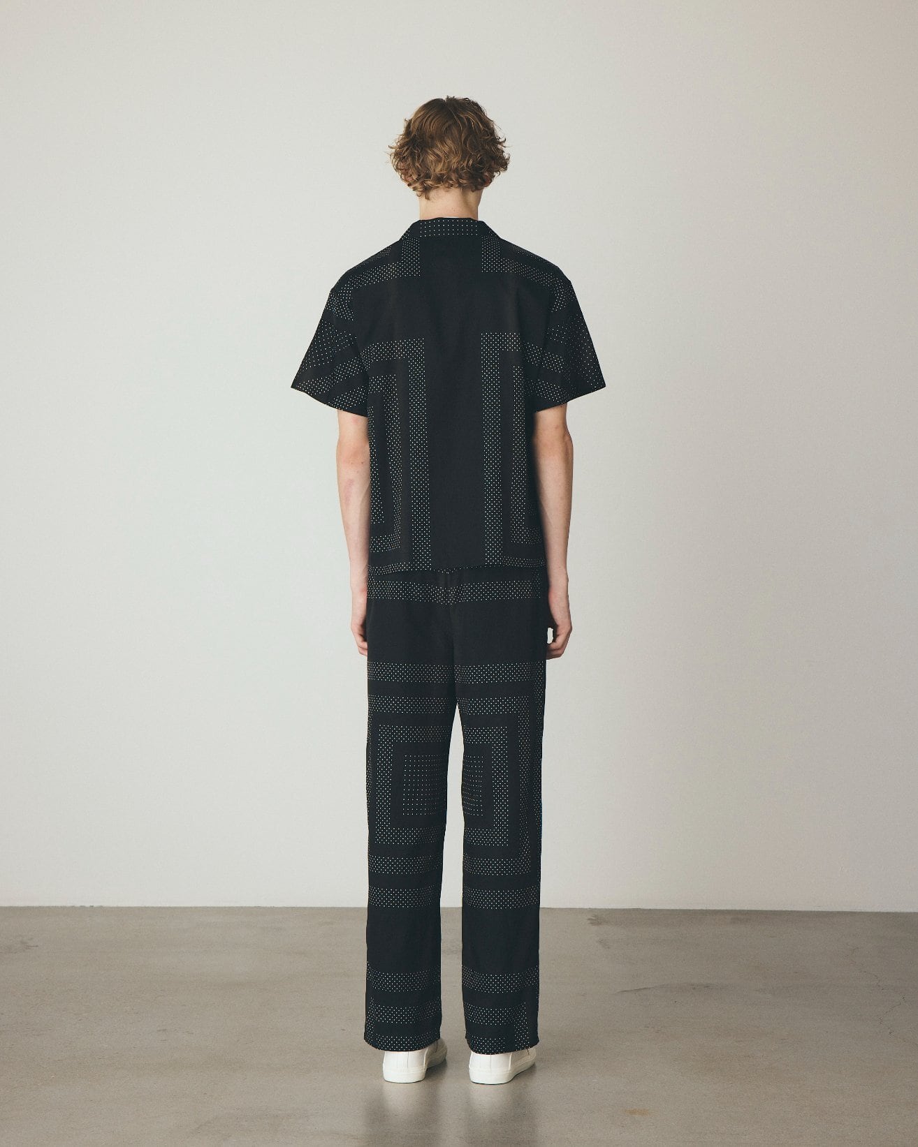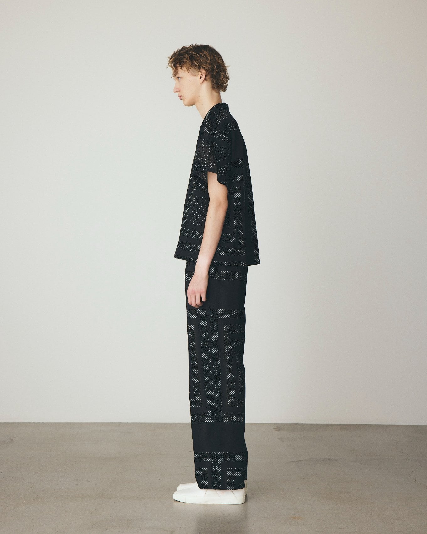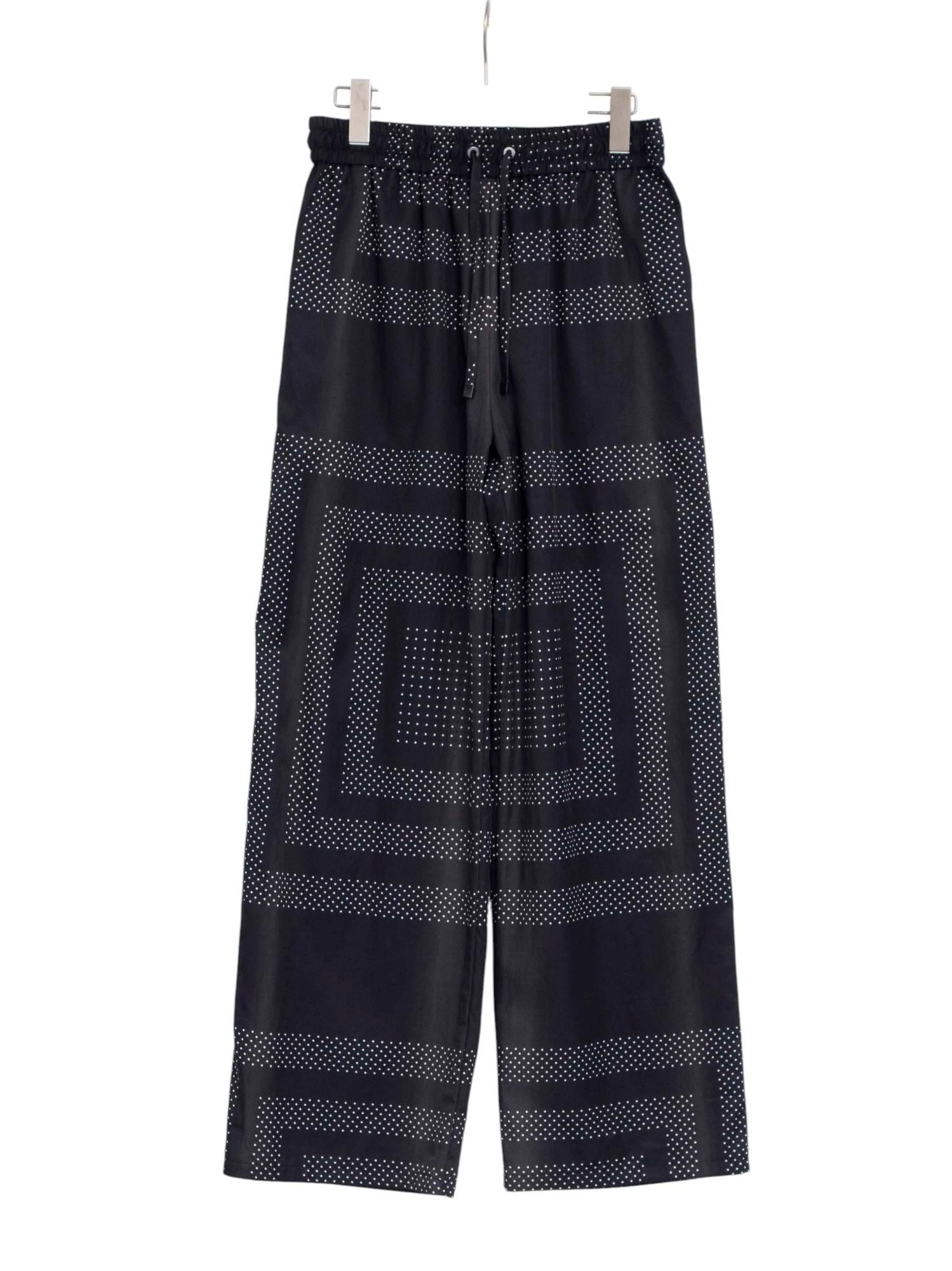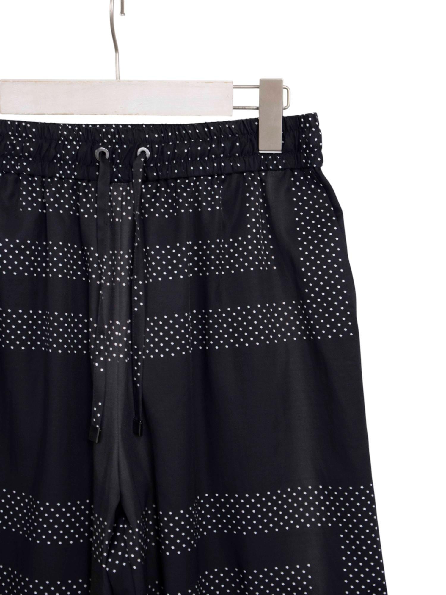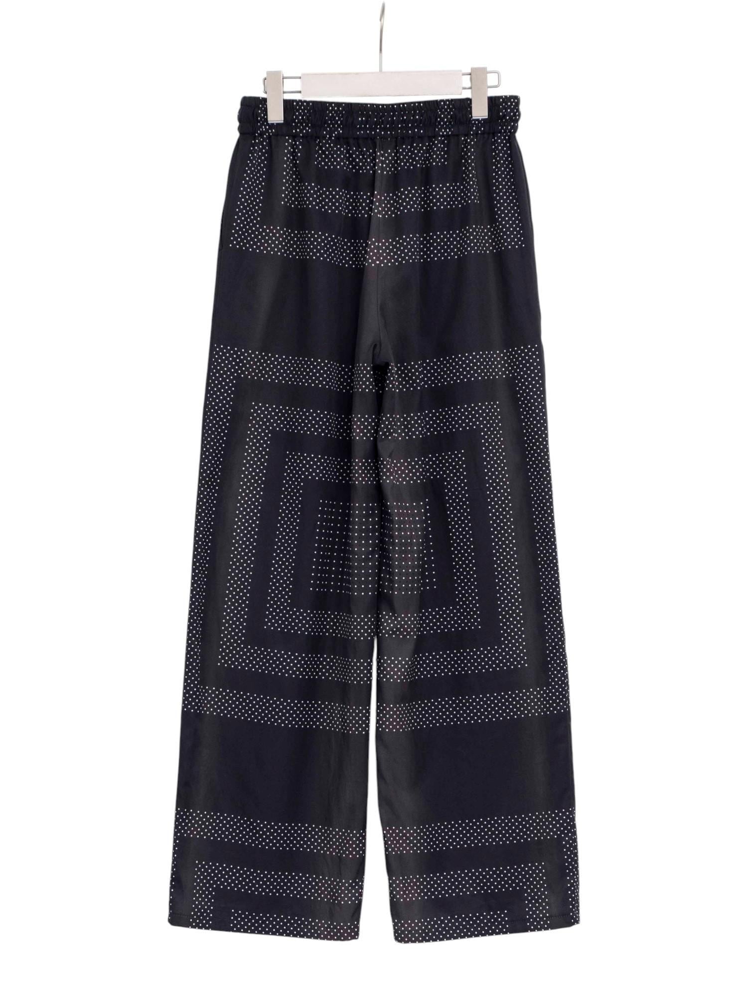 オリジナルのドット柄をカレ風に構成し、縞のように淡く流れるグラデーションで奥行きを描いたイージーパンツ。