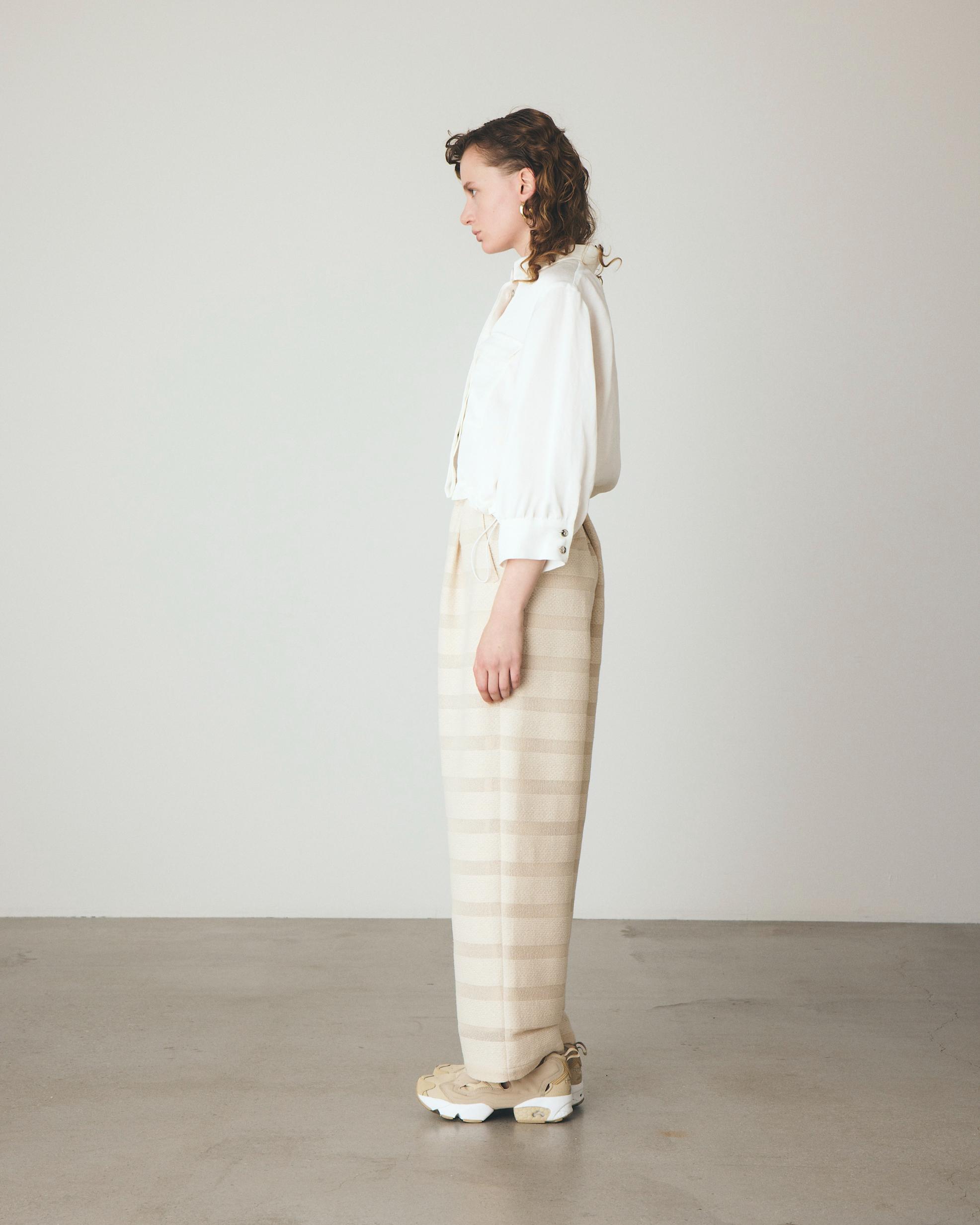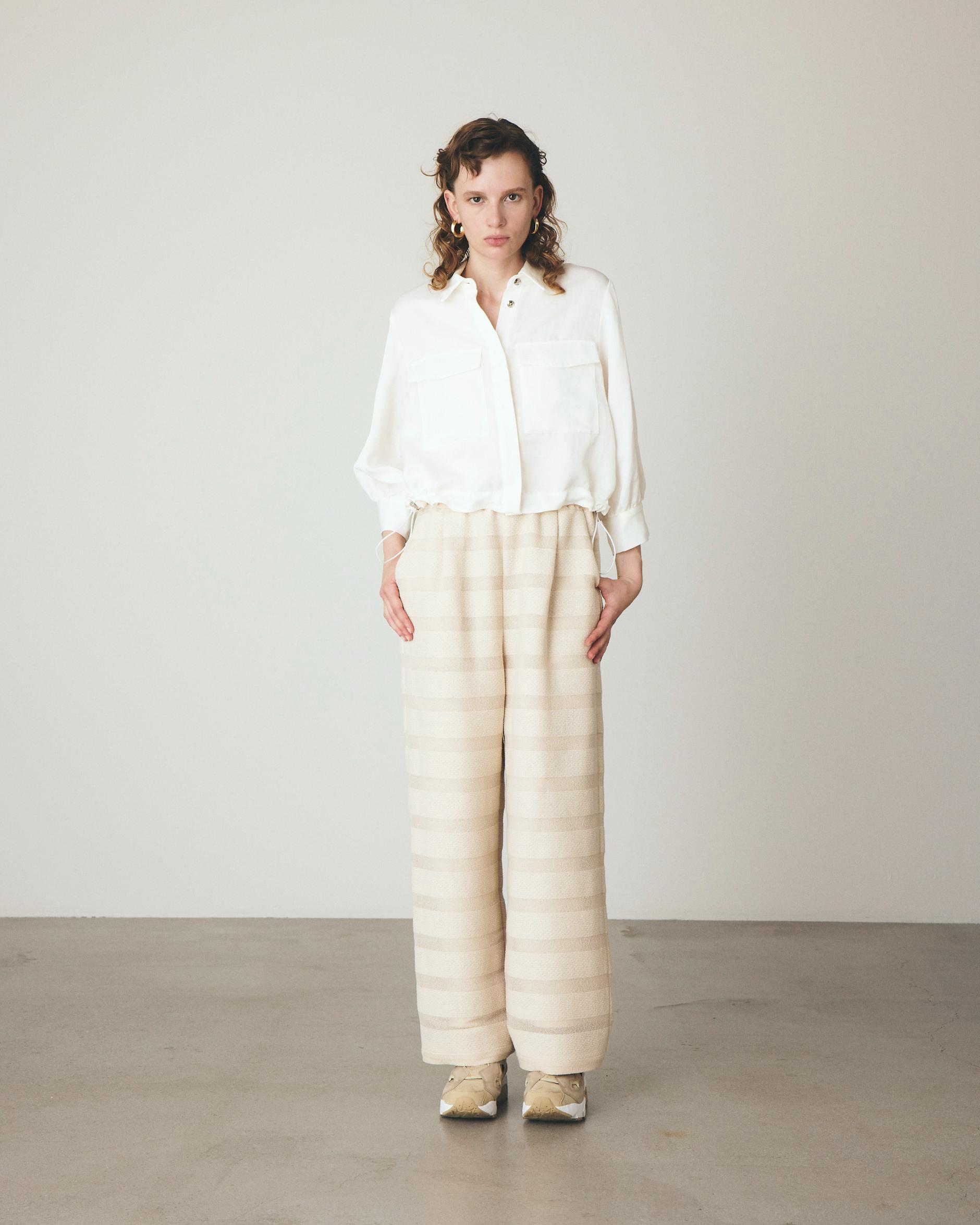 ウエストのドローコードでシルエットを自在に変えられ、コンパクトなショート丈が涼しげなバランスを演出。