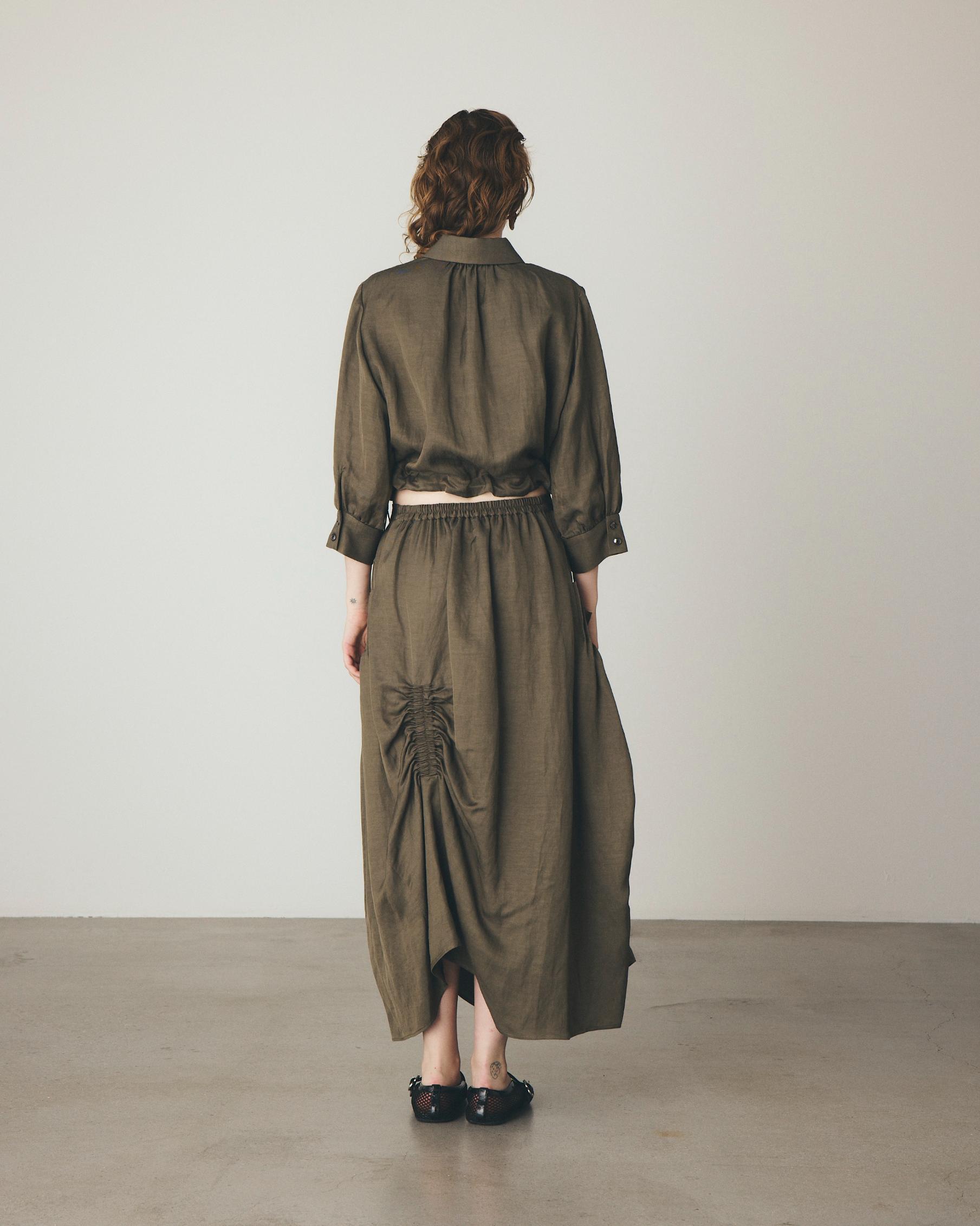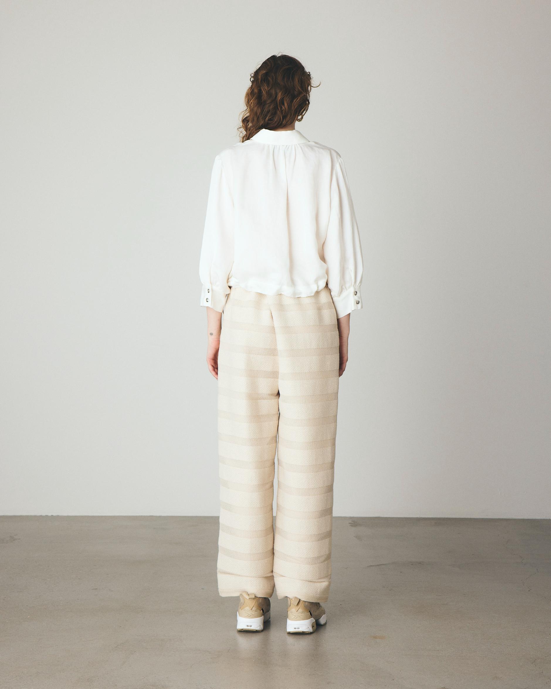 ヴィスコースの柔らかな光沢と落ち感に、リネン特有のスラブ感とハリが加わり、まるできめ細やかな氷がとけていくような、上品で軽やかな表情を生み出します。