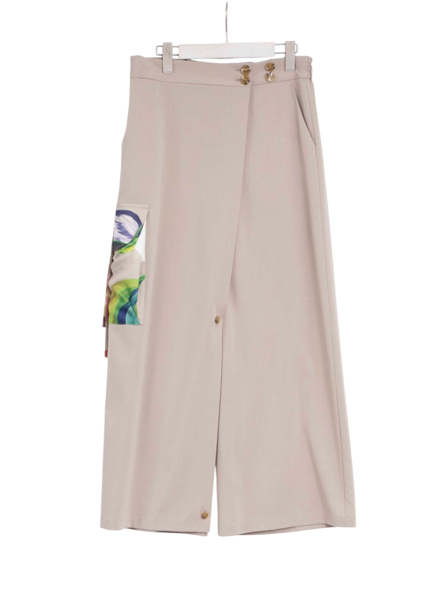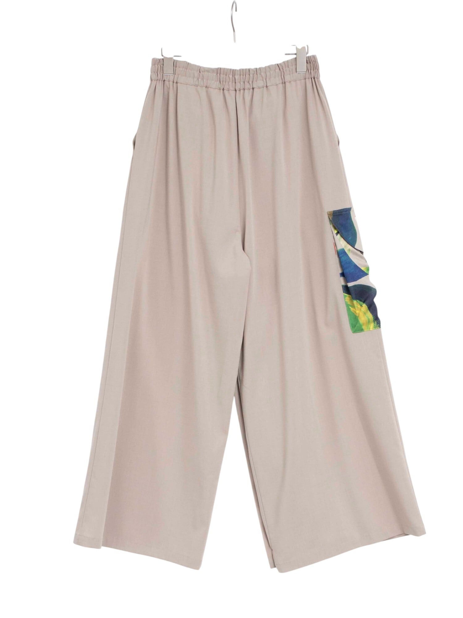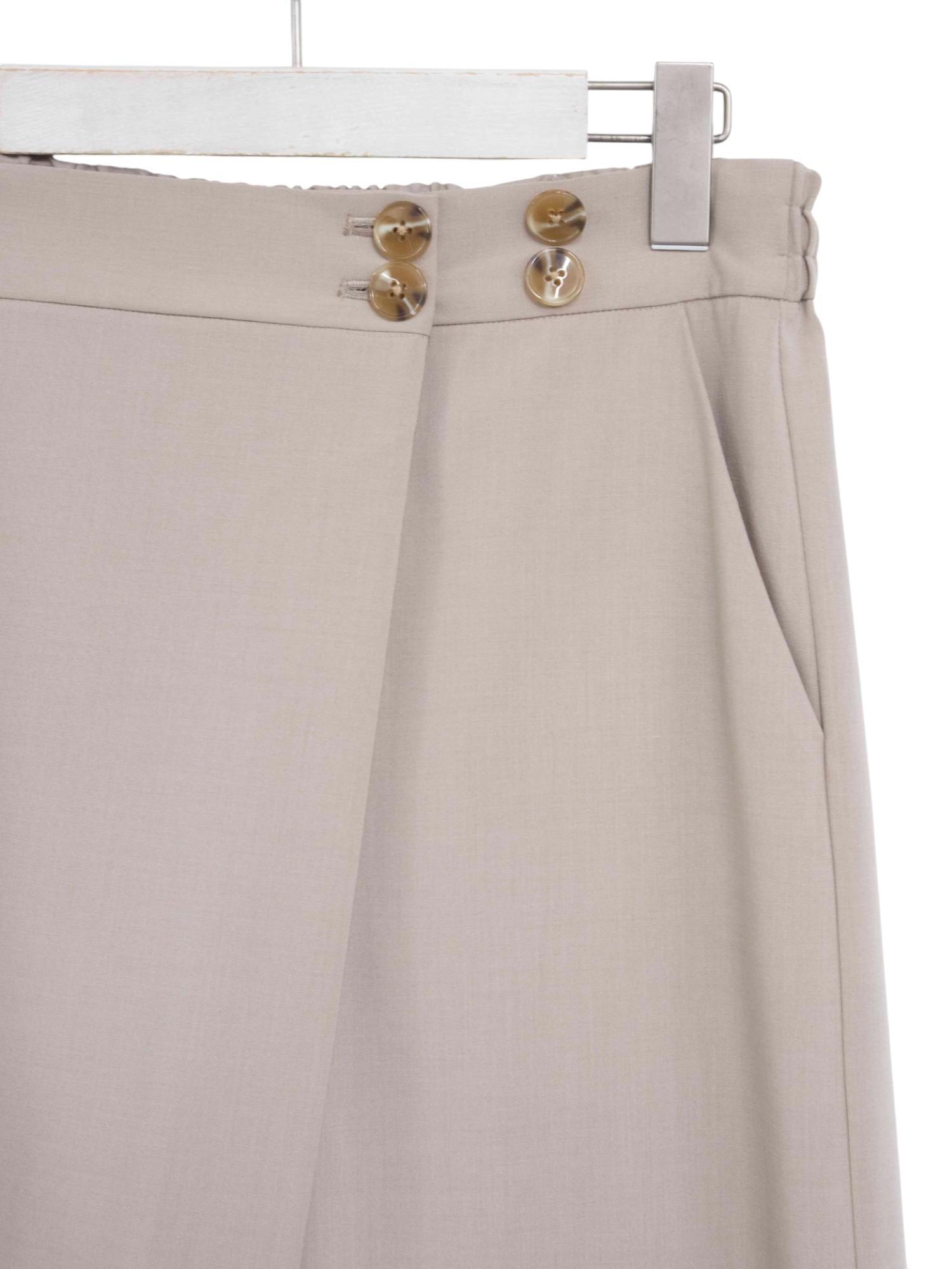 ディテール: アシンメトリーデザイン、片側カーゴポケット(オリジナル生地使用)、ウエストゴム+ボタン仕様