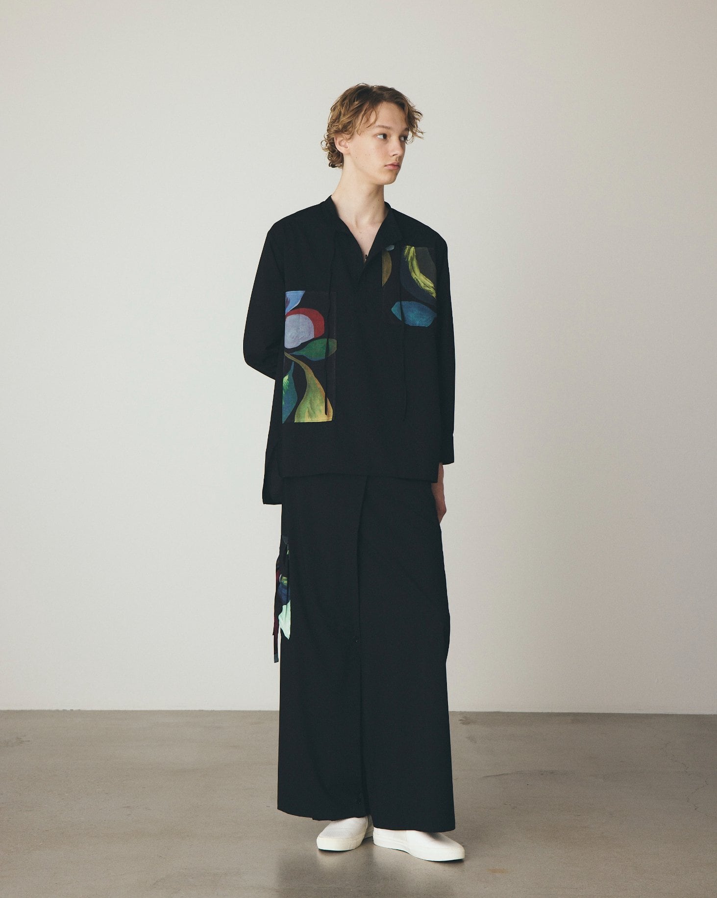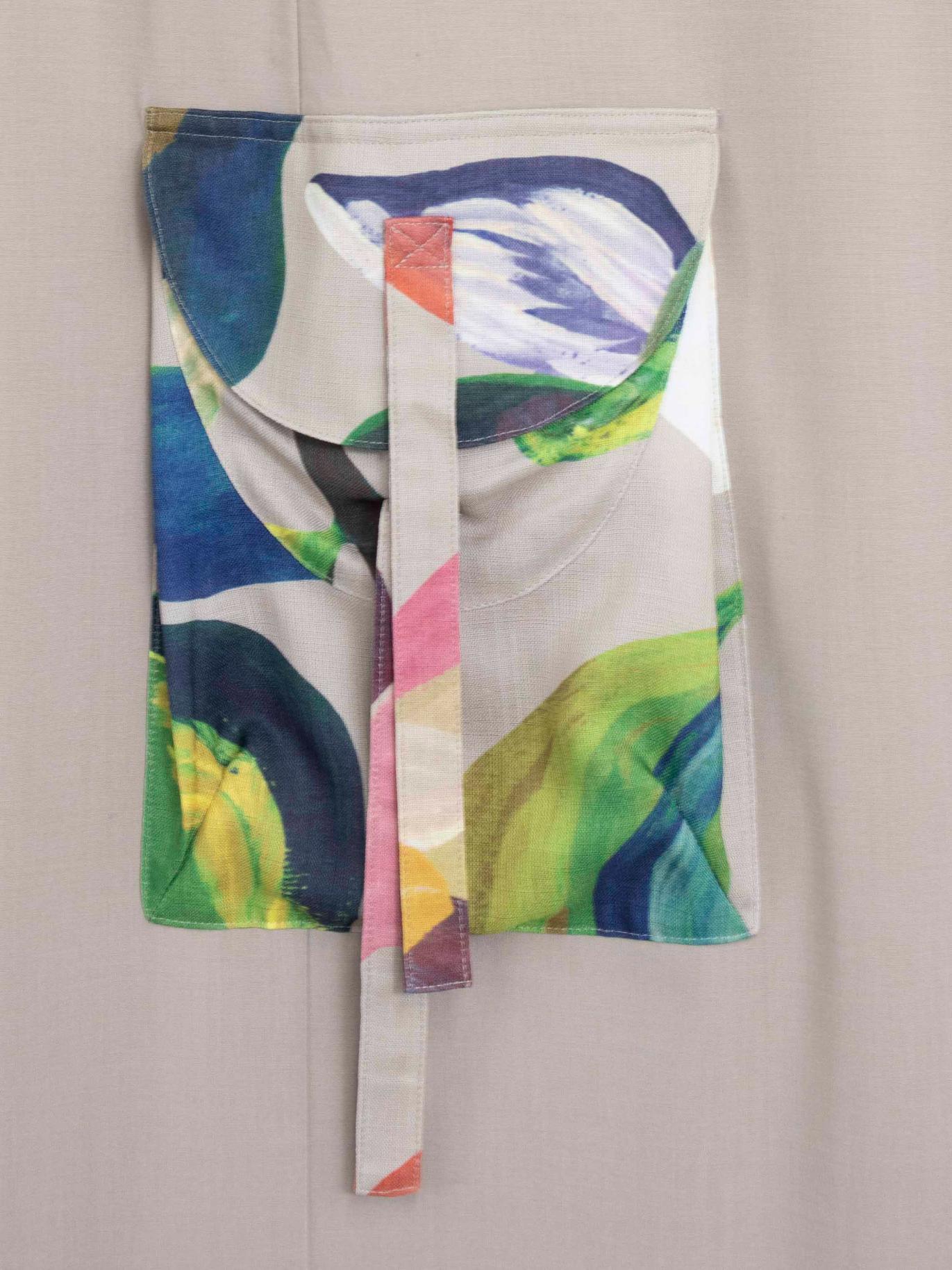 片方にカーゴパンツをイメージした大きめのポケットを配置し、さらにそのポケットにはオリジナルのフラワープリント生地を使用。