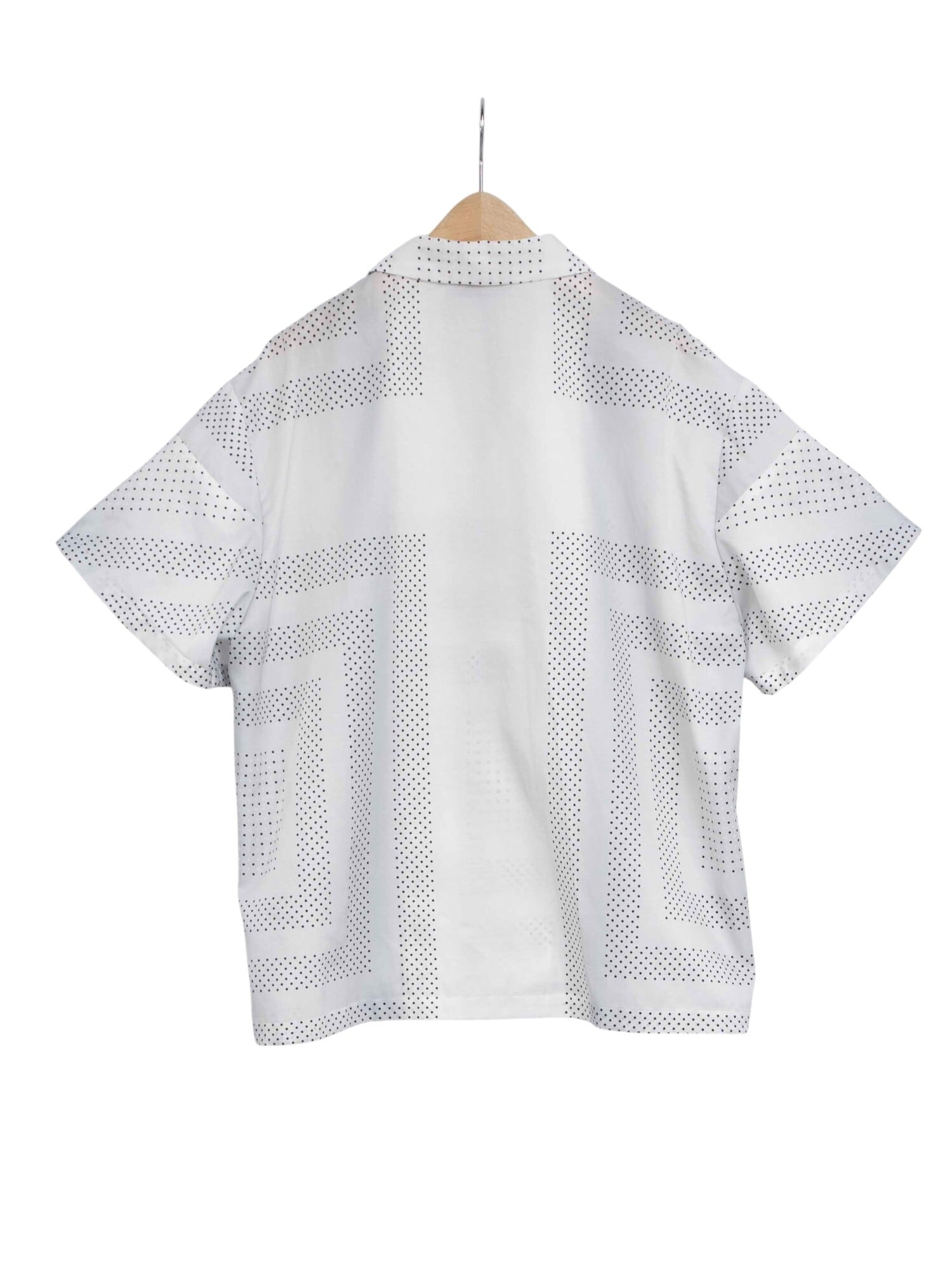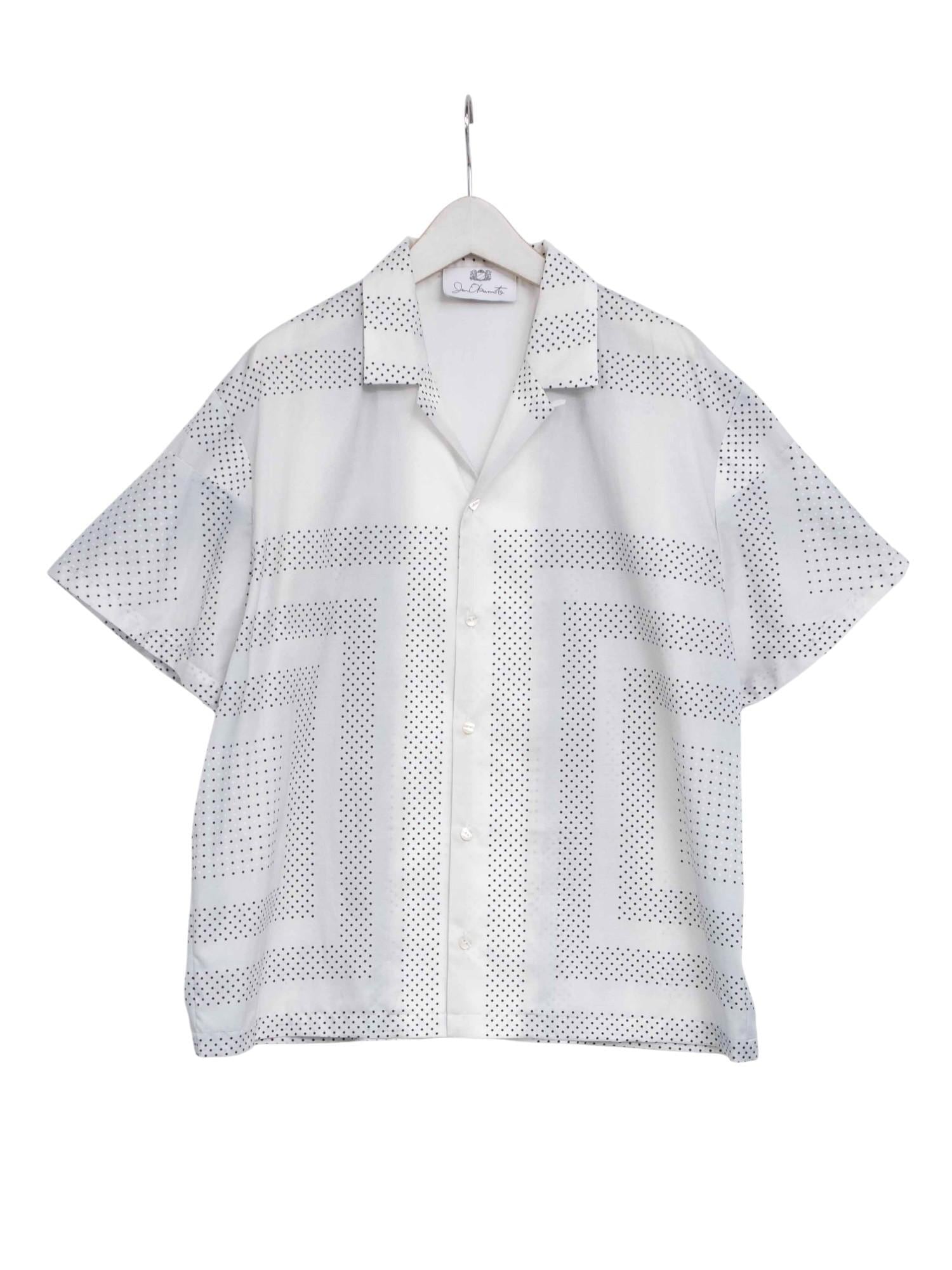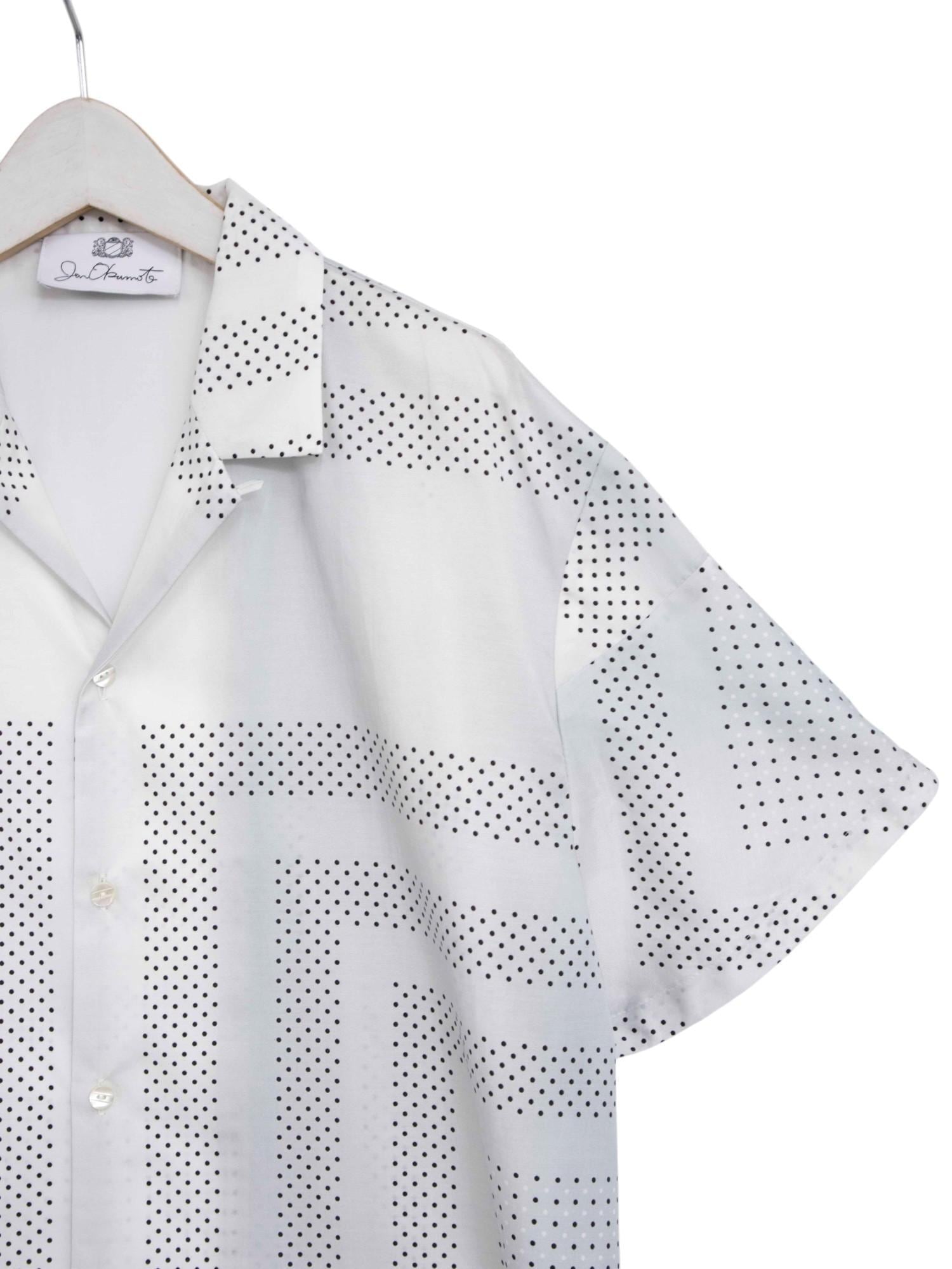 オリジナルで描いたドット柄をカレ風に構成し、ほんのりストライプ状に流れるグラデーションで奥行きを表現した開襟シャツ。