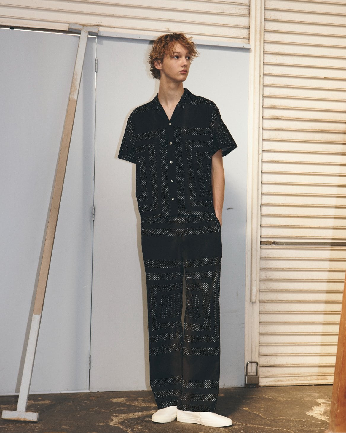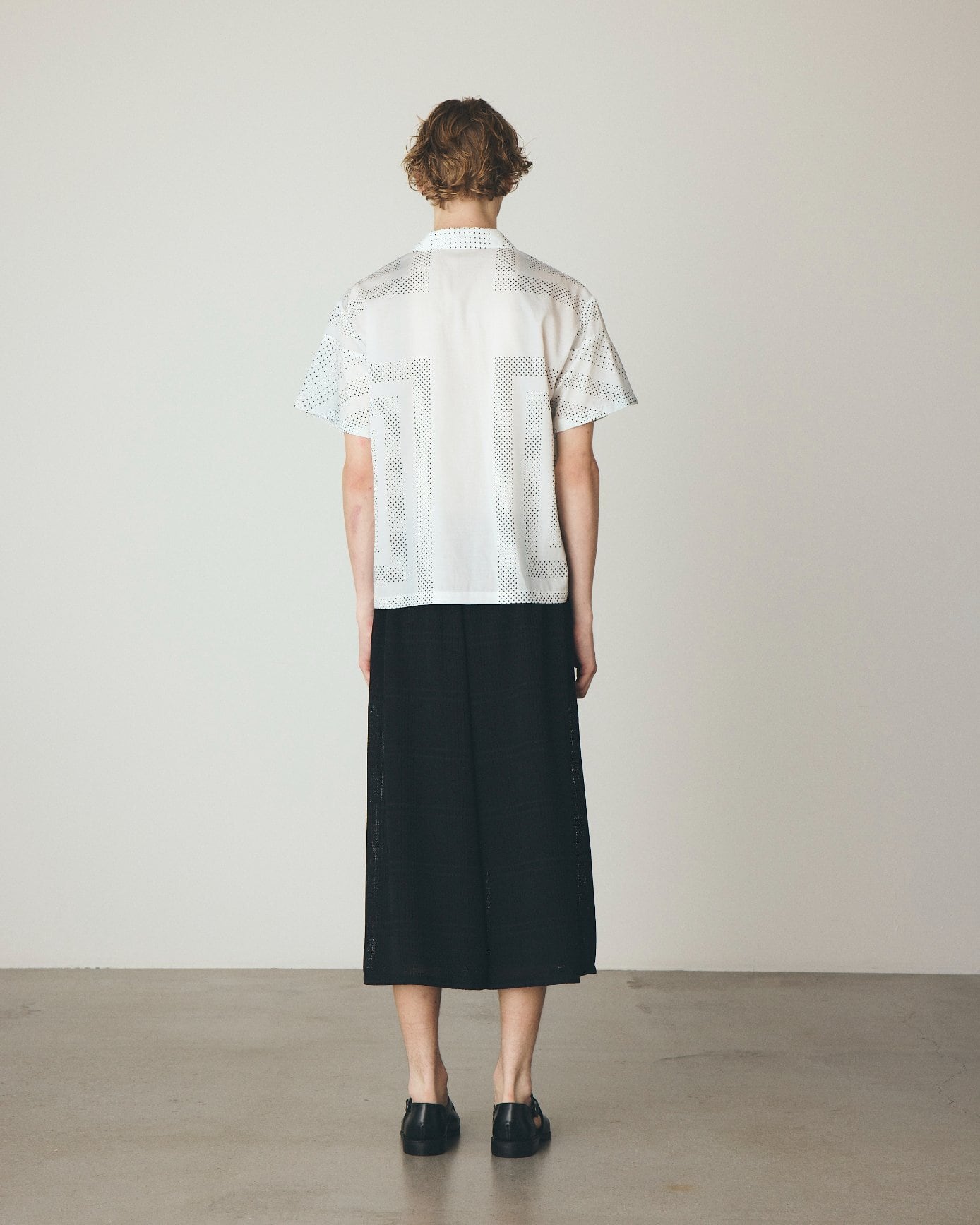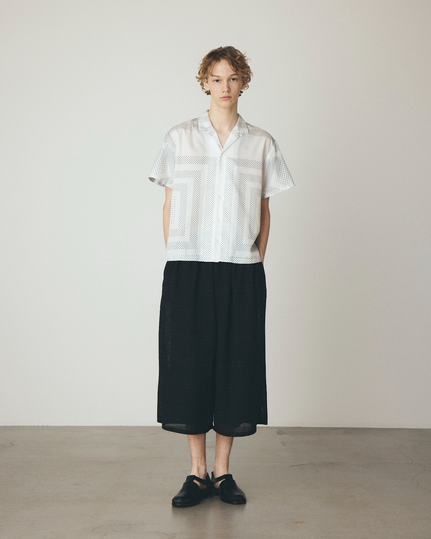 オリジナルで描いたドット柄をカレ風に構成し、ほんのりストライプ状に流れるグラデーションで奥行きを表現した開襟シャツ。