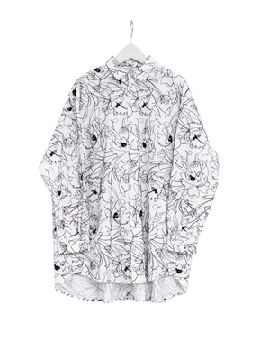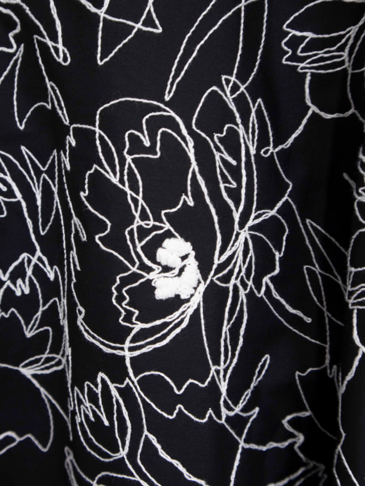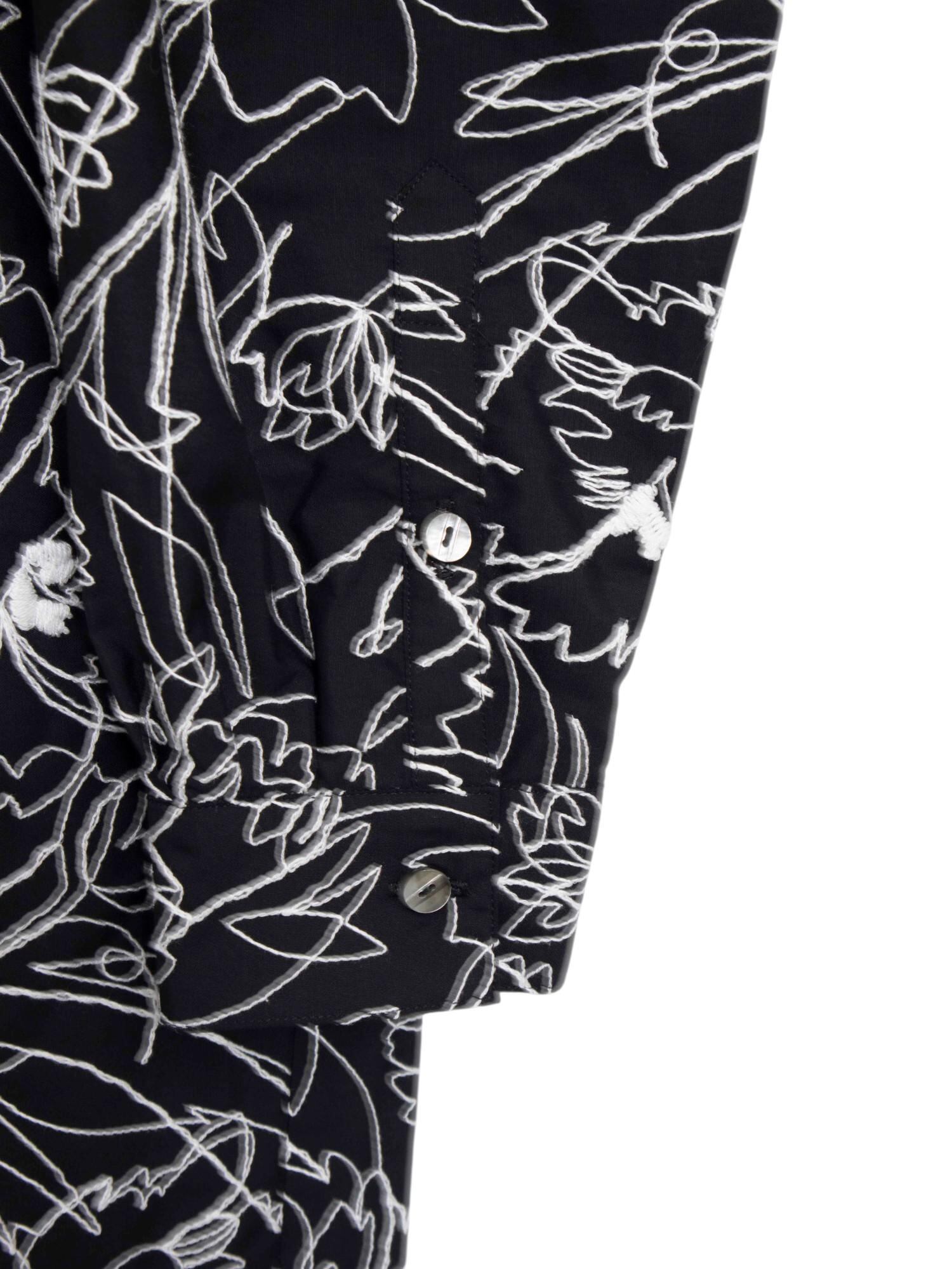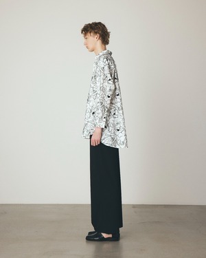 一筆書きの大胆なフラワーモチーフが全面を彩り、まるでキャンバスに描かれた線画を纏うような存在感を放ちます。