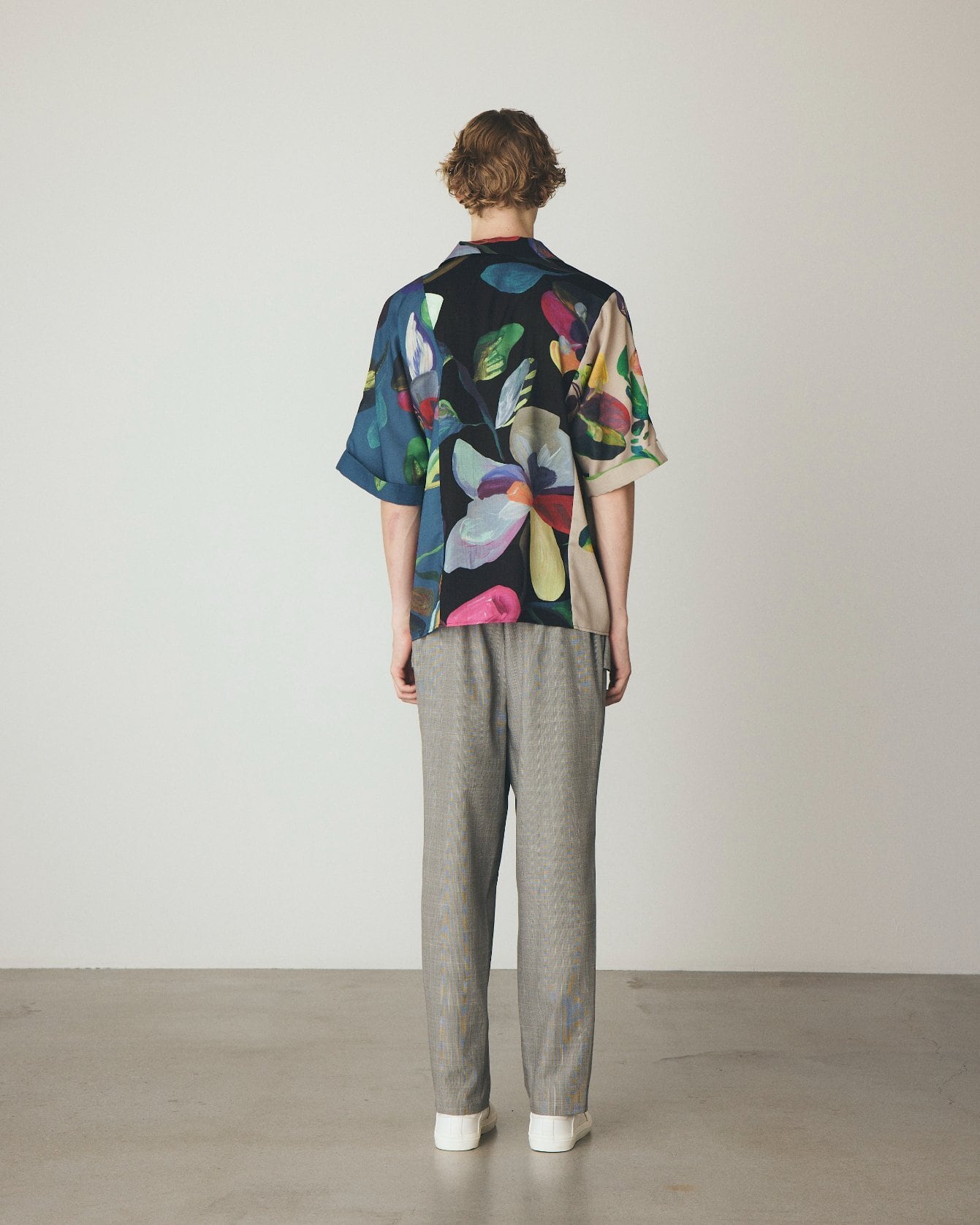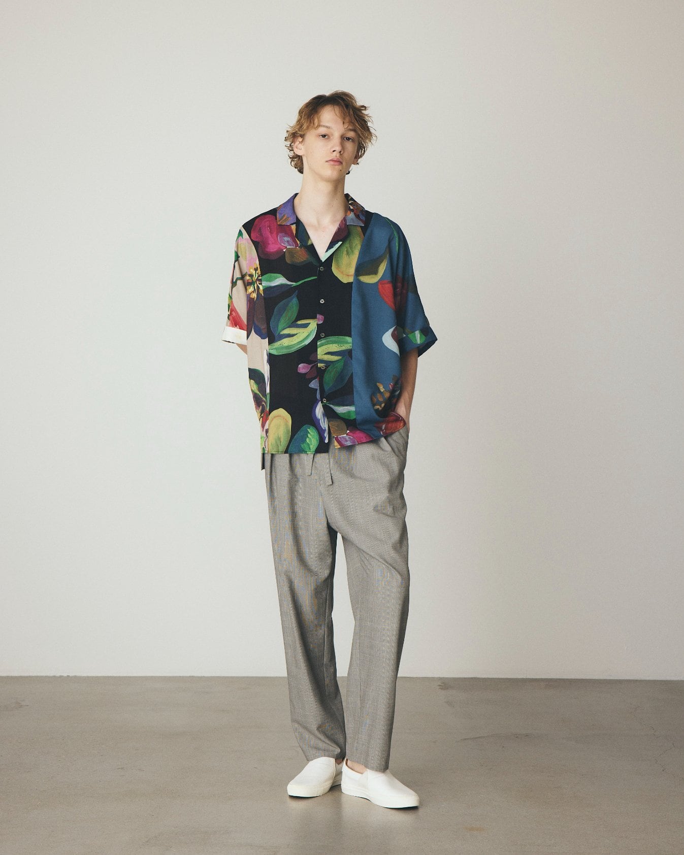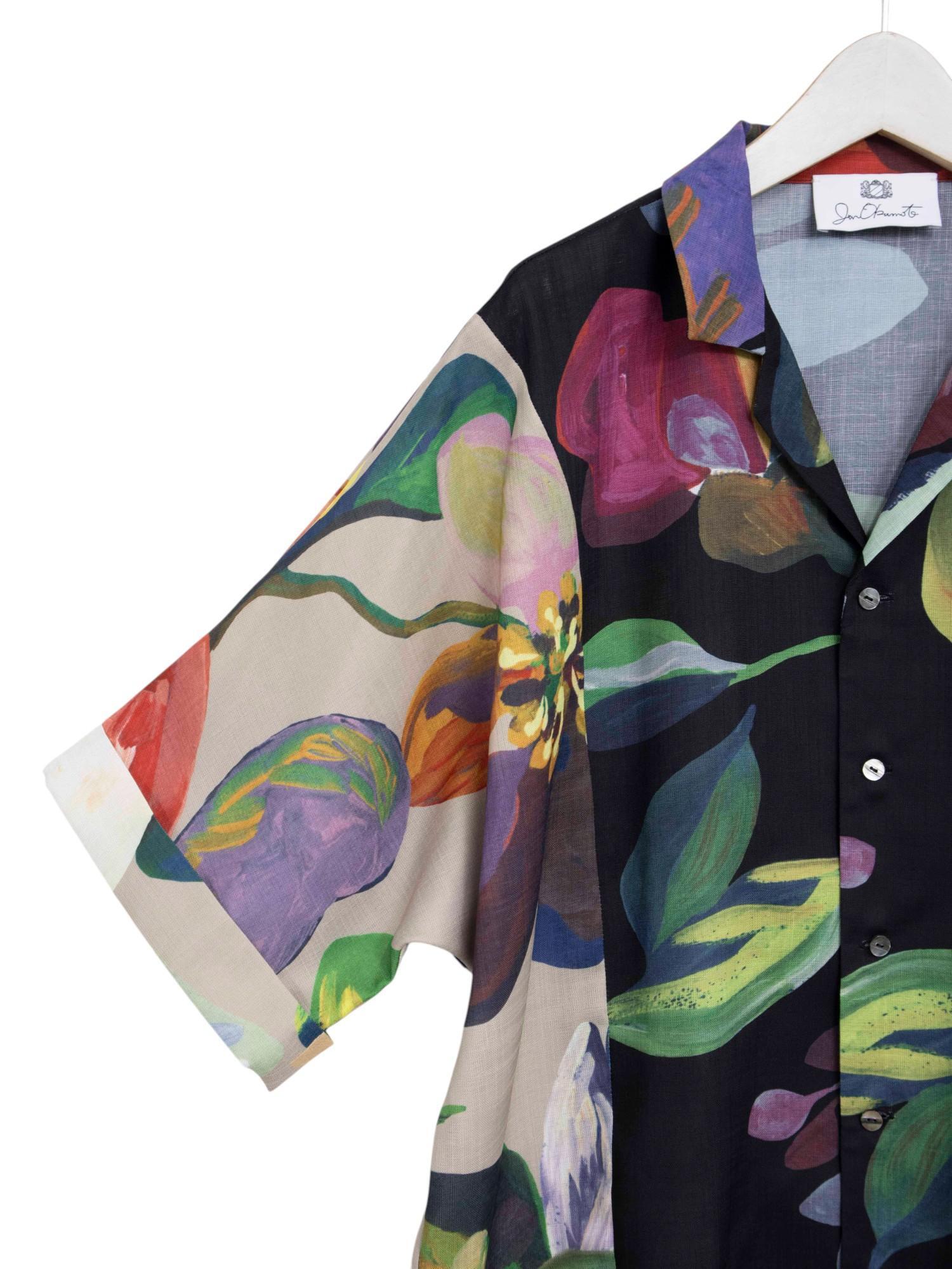 ピカソやゴーギャンの花のモチーフからインスピレーションを得たフラワープリントを、ベージュ・グリーン・ブラックの3色で切り替えた大胆な開襟シャツ。