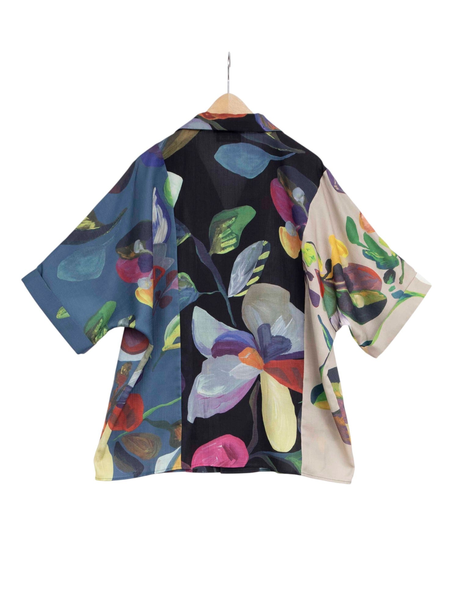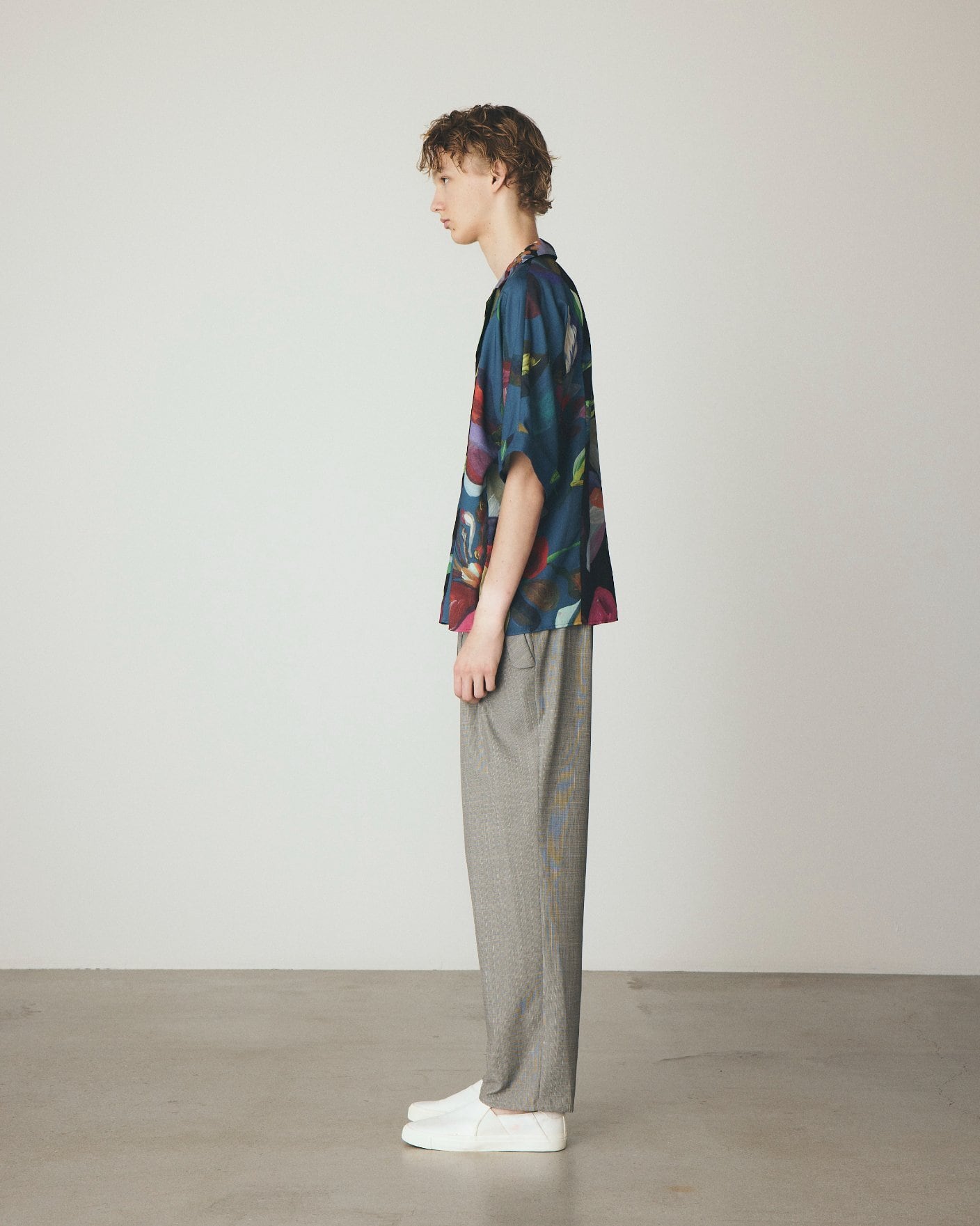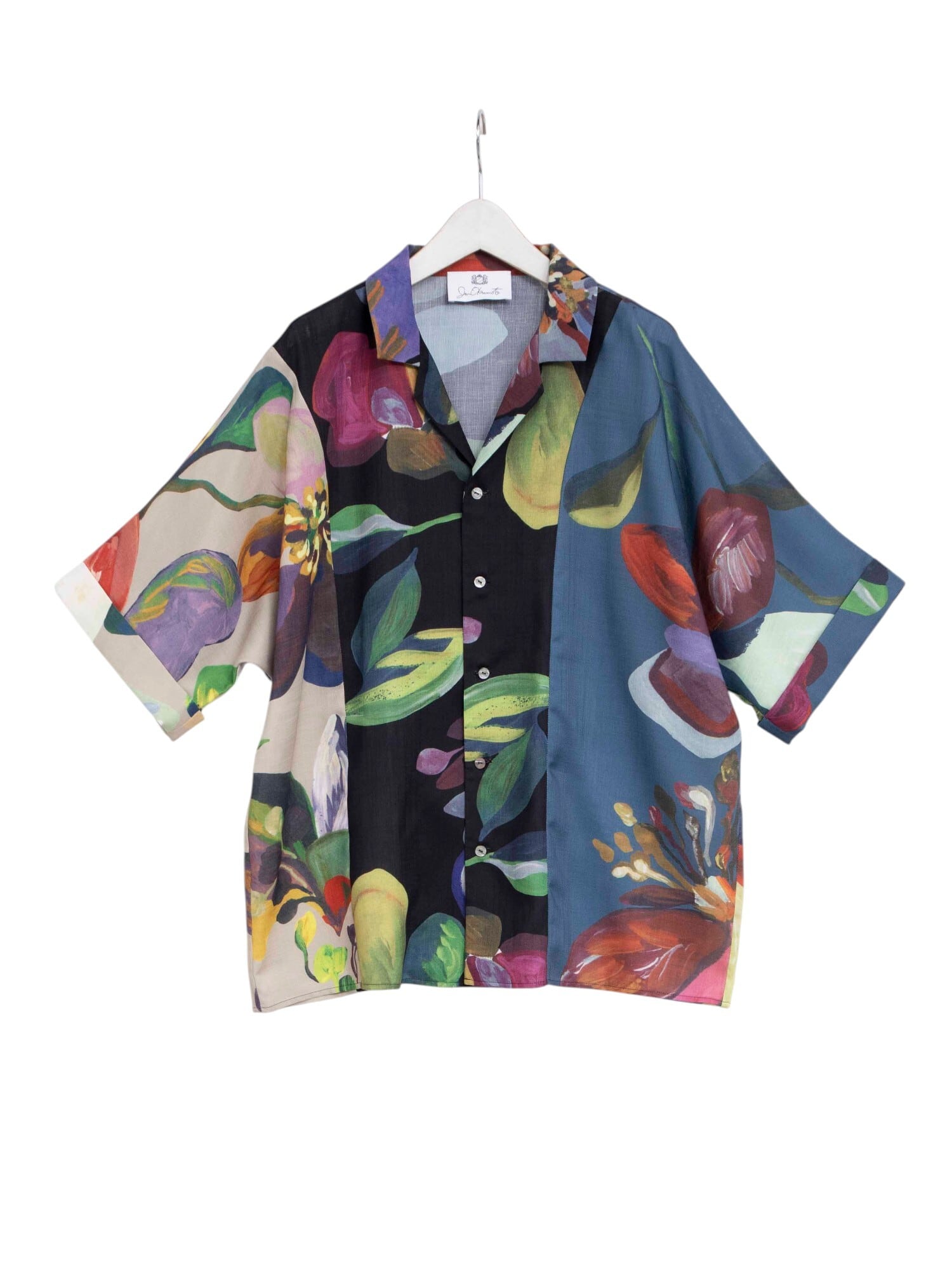 ピカソやゴーギャンの花のモチーフからインスピレーションを得たフラワープリントを、ベージュ・グリーン・ブラックの3色で切り替えた大胆な開襟シャツ。